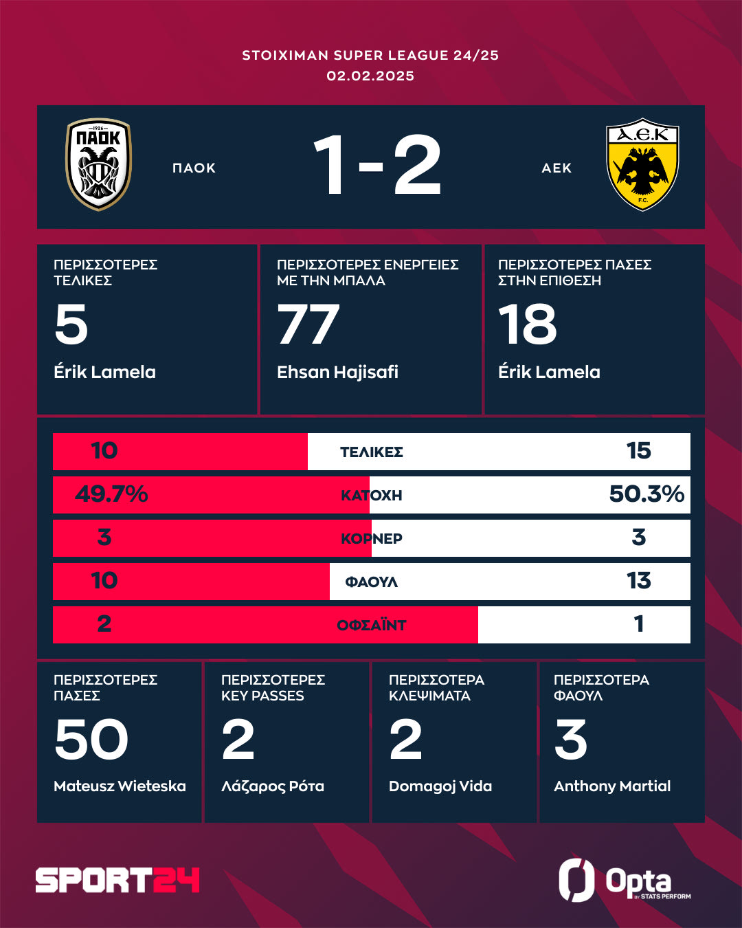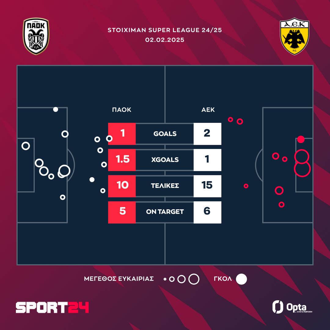 Η ΑΕΚ πήρε το ντέρμπι με τον ΠΑΟΚ με 2-1 και μένει ζωντανή στη μάχη του τίτλου, ενώ οι Θεσσαλονικείς είναι στο -10 και πλέον τα πράγματα γίνονται πιο δύσκολα για τη συνέχεια. Δύο γκολ από τον Έρικ Λαμέλα με το πρώτο να είναι εξαιρετικό, ενώ ο Μπάμπα μείωσε στο 52′.