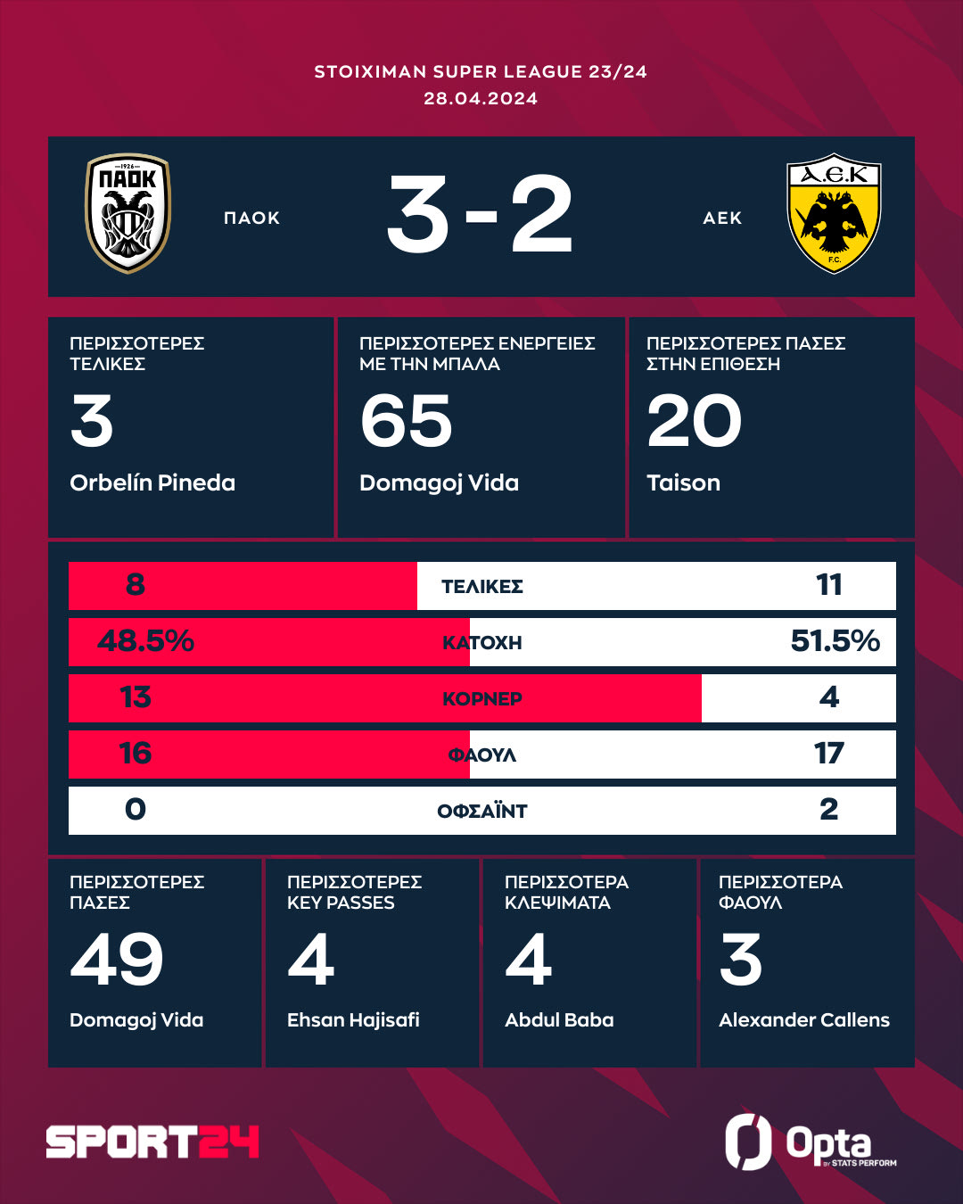 Ο ΠΑΟΚ πανηγύρισε μία μεγάλη νίκη, επικρατώντας 3-2 της ΑΕΚ με ανατροπή για την 8η αγωνιστική των playoffs της Stoiximan Super League, βάζοντας "φωτιά" στο πρωτάθλημα. Ήρωας ο Σάστρε στο 90+1', πρωταγωνιστής ο Κωνσταντέλιας με δύο γκολ (3', 81'). Πινέδα (9') και Βίντα (75') τα γκολ της Ένωσης.