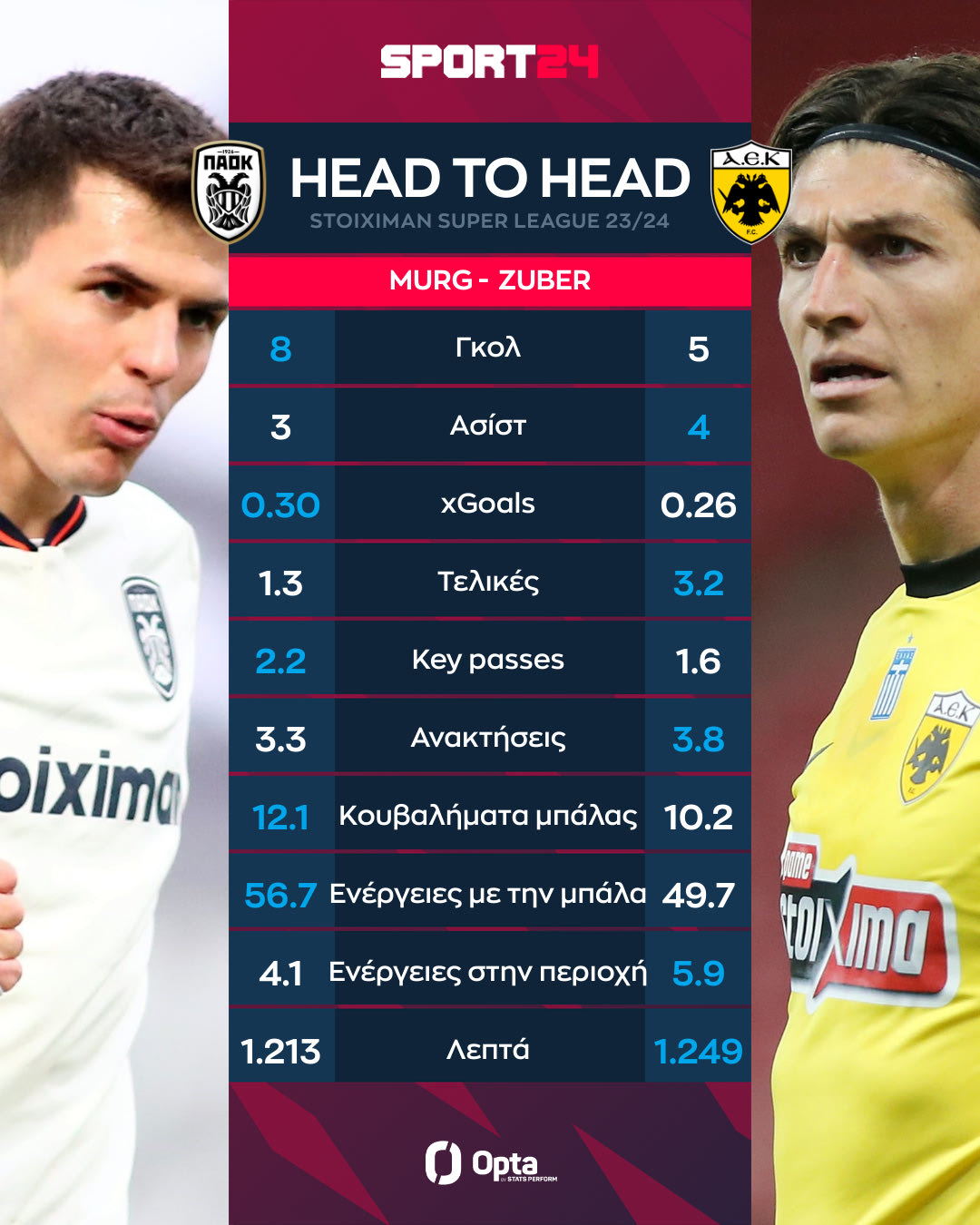 Ο ΠΑΟΚ φιλοξενεί την ΑΕΚ (11/2, 20:00, Novasports Prime, LIVE από το SPORT24) στον τελευταίο χρονικά αγώνα της 22ης αγωνιστικής της Stoiximan Super League, με τους Ραζβάν Λουτσέσκου και Ματίας Αλμέιδα να ποντάρουν πολλά στη μεσοεπιθετική τους γραμμή και δη στους δεύτερους επιθετικούς τους. Ο "αναγεννημένος" Τόμας Μουργκ και ο πάντα παρών στις μεγάλες μάχες Στίβεν Τσούμπερ είναι οι άσσοι στα μανίκια των προπονητών. Δείτε τη σύγκριση των δύο παικτών που έχουν την ποιότητα να κρίνουν την έκβαση του ντέρμπι κορυφής.