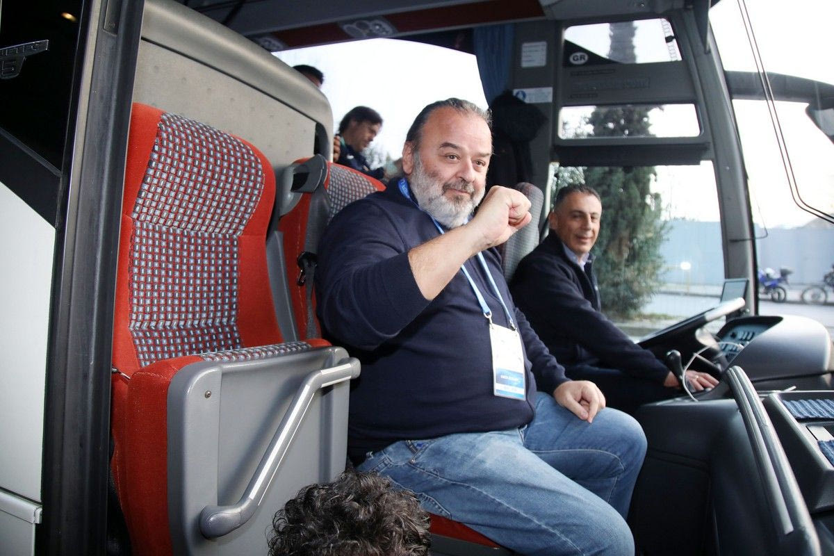 Με υψωμένη τη γροθιά ο Μάριος Ηλιόπουλος στο λεωφορείο, λίγο πριν την αναχώρηση της ΑΕΚ για το γήπεδο της Τούμπας INTIME