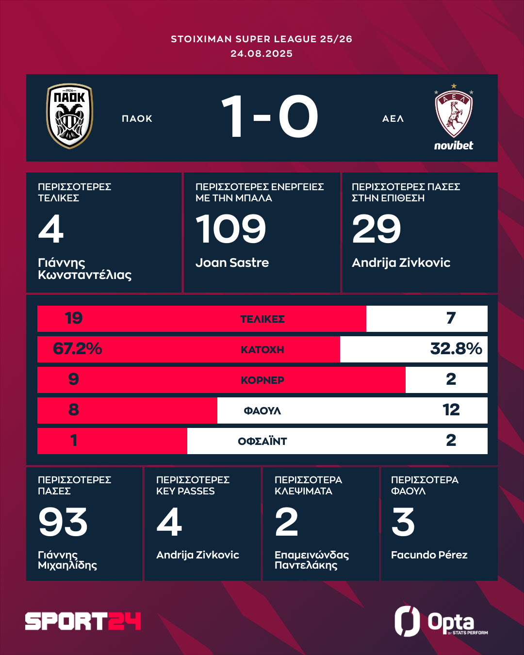 - ΑΕΛ NOVIBET: Μελισσάς, Δεληγιαννίδης, Κοσσόνου (22′ Κοβάσεβιτς), Παντελάκης, Τσάκλα, Στάικος (72′ Πασάς), Πέρες, Ατανάσοβ (80′ Σουρλής), Τούπτα, Γιούσης, Μούργος (80′ Χατζηστραβός)