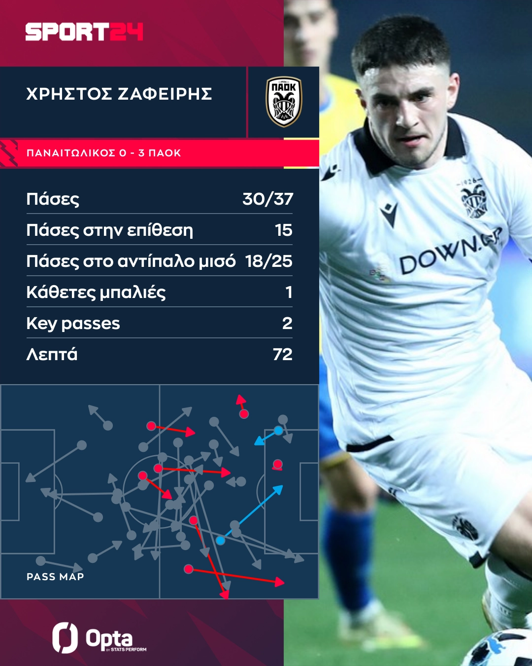 Ο 22χρονος διεθνής μέσος δημιούργησε μία μεγάλη ευκαιρία, είχε 2 key passes, ενώ στα 72 λεπτά που βρέθηκε στο γήπεδο είχε και 1 κάθετη μπαλιά.