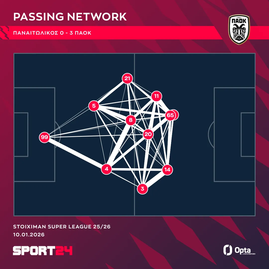 Όπως φαίνεται στο γράφημα της Opta / Stats Perform με τις μέσες θέσεις των ενεργειών των ποδοσφαιριστών του ΠΑΟΚ στο Αγρίνιο, ο Ζαφείρης ήταν ακριβώς στο κέντρο τους.