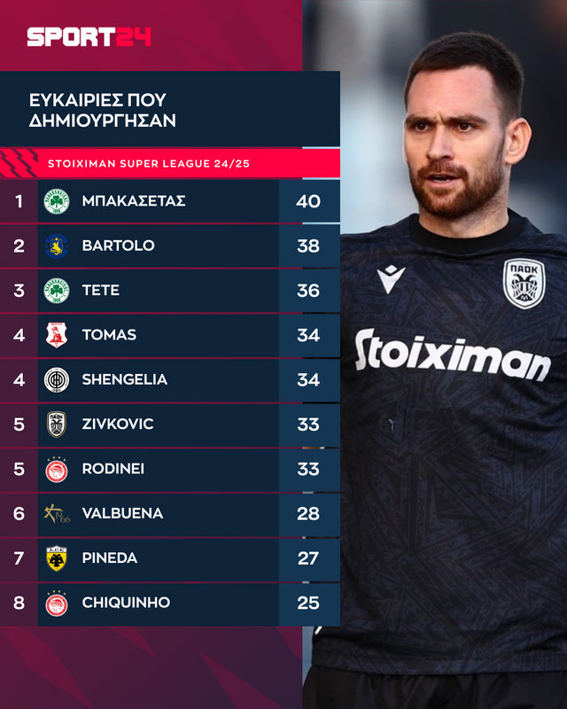 Όπως γίνεται εύκολα αντιληπτό, ο ΠΑΟΚ θα στερηθεί τον ποδοσφαιριστή που έχει δημιουργήσει μέχρι στιγμής τις πιο απειλητικές τελικές στο πρωτάθλημα.