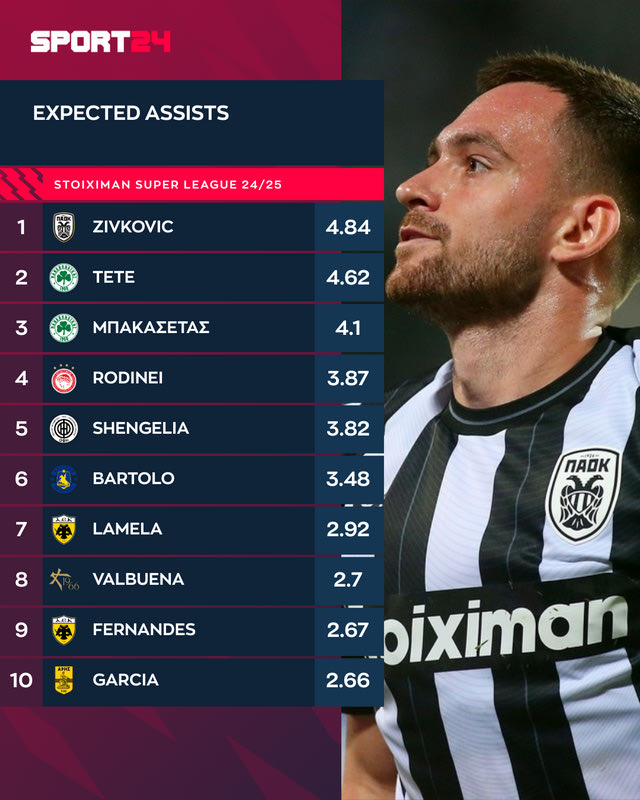 Ο Αντρίγια Ζίβκοβιτς λοιπόν είναι στην κορυφή της σχετικής λίστας στη Stoiximan Super League, με τις μεταβιβάσεις του να “αξίζουν” 4.84 xAssists.