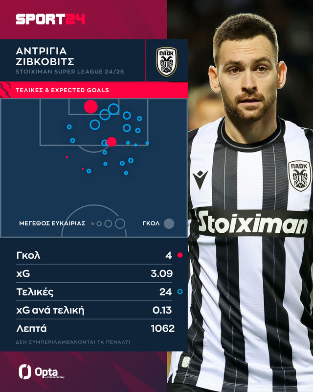 Ο Ζίβκοβιτς είναι ο πρώτος σκόρερ των “μελανόλευκων” σε όλες τις διοργανώσεις με 8 γκολ ενώ στο γράφημα της Opta Stats / Perform με τον χάρτη των τελικών του στη Stoiximan Super League γίνεται σαφής η ικανότητά του να βρίσκει με συνέπεια τελικές στην αντίπαλη περιοχή, πλαγιοκοπώντας την από δεξιά.