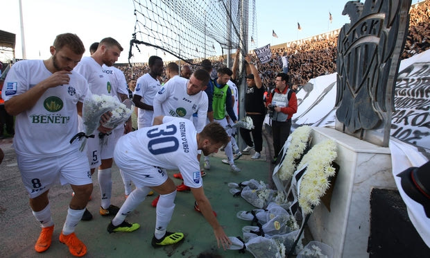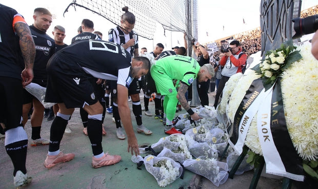 Παράλληλα, με μαύρα περιβραχιόνια σε ένδειξη πένθους αγωνίστηκε στο ματς η ομάδα του Ραζβάν Λουτσέσκου κόντρα στην “Ελαφρά Ταξιαρχία”. Ο κόσμος του ΠΑΟΚ χειροκρότησε τις δυο ομάδες, ενώ δεν ακουγόταν το παραμικρό στο ενός λεπτού σιγής για τα θύματα.