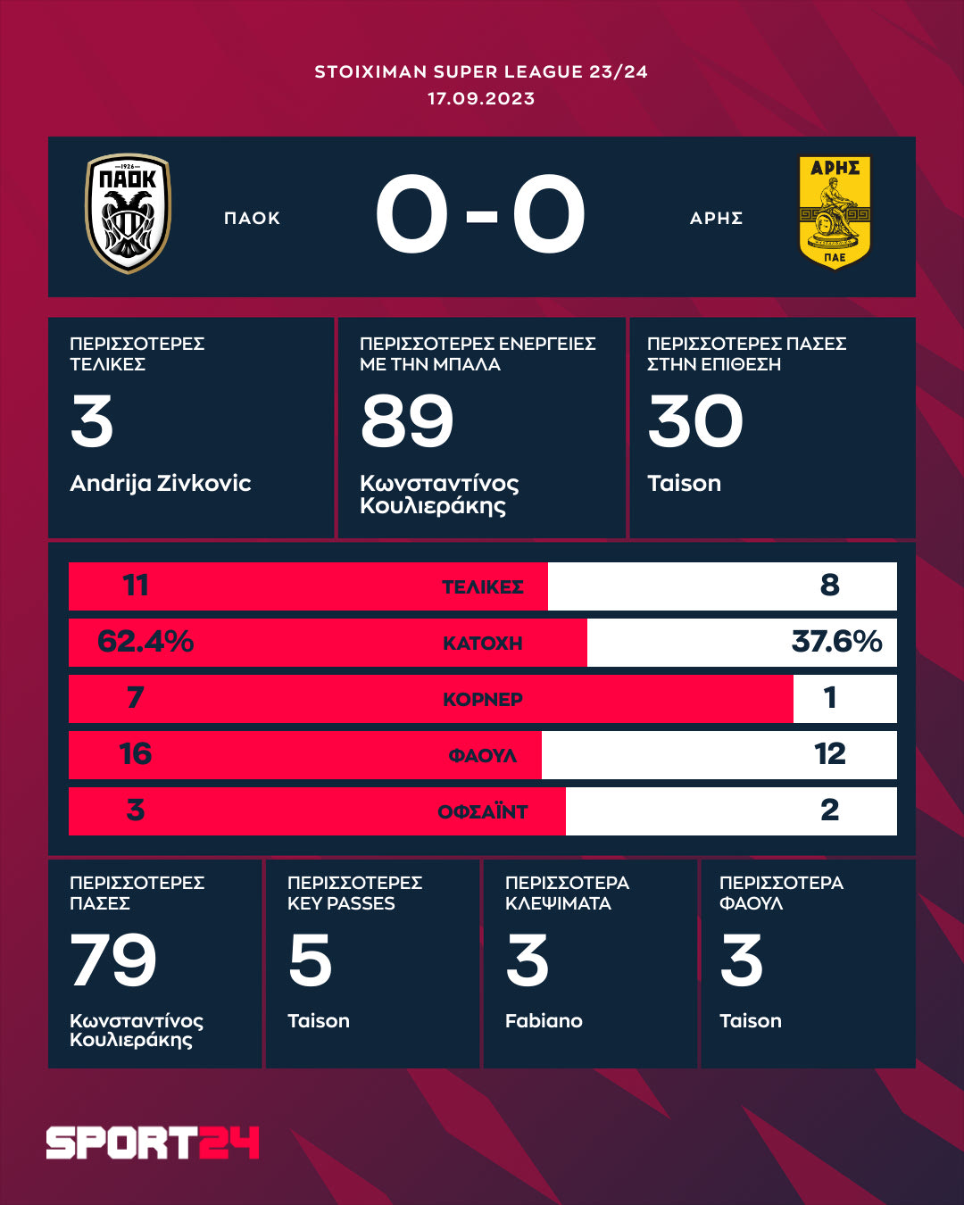 ΠΑΟΚ: Κοτάρσκι, Βιεϊρίνια (72′ Κετζιόρα), Εκόνγκ, Κουλιεράκης, Μπάμπα, Μεϊτέ, Οζντόεφ (72′ Σβαμπ), Κωνσταντέλιας (65′ Ντεσπόντοφ), Ζίβκοβιτς, Τάισον (90′ Μουργκ), Σαματά (72′ Μπράντον)