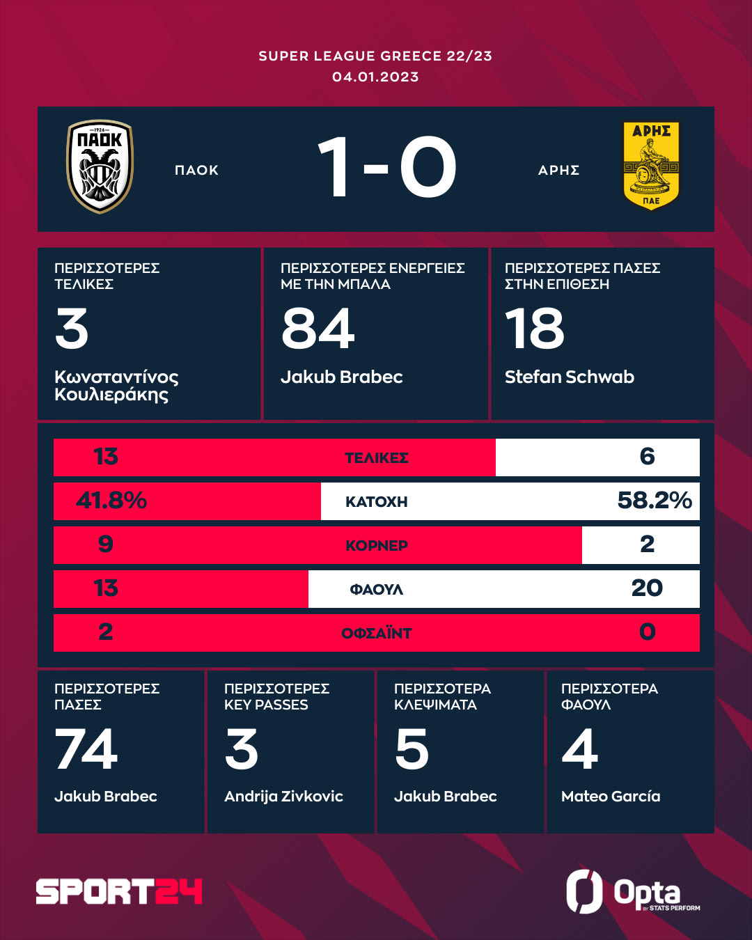 Ο Δικέφαλος ήταν καλύτερος στο πρώτο μέρος και κατάφερε να πάρει “κεφάλι” με ανάποδο ψαλίδι του Ίνγκασον στο 45+2′. Μάλιστα νωρίτερα είχε χάσει πέναλτι, ενώ είχε και δοκάρι. Στο δεύτερο μέρος ο Άρης ανέβασε τον ρυθμό του, πήρε κατοχή, ωστόσο δεν κατόρθωσε να βρει απάντηση στο γκολ του Ισλανδού.