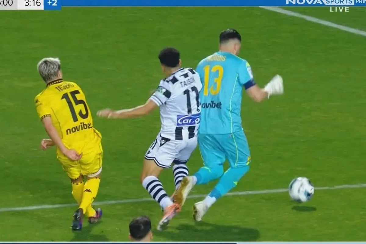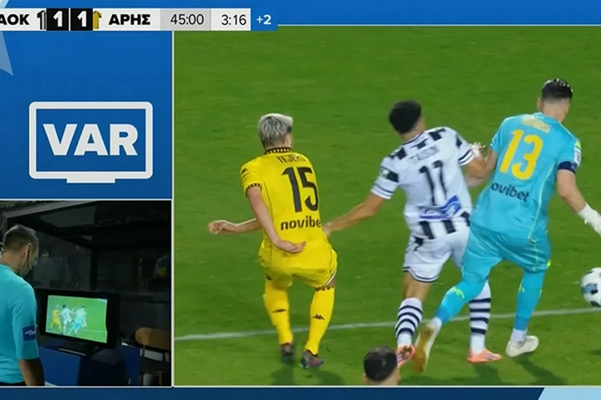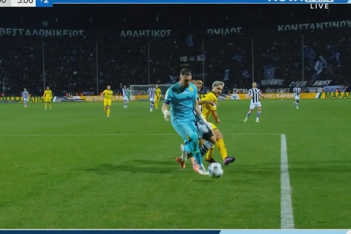 Ωστόσο, στη συνέχεια τον κάλεσε ο διαιτητής VAR και μετά από on-field review έδωσε παράβαση κατά του τερματοφύλακα των “κίτρινων”.