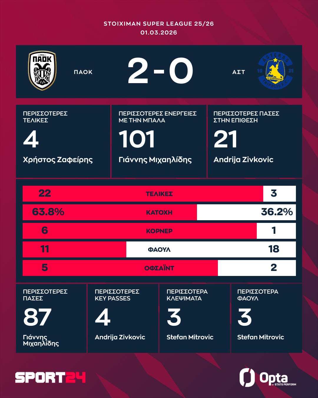 Ο Δημήτρης Χατσίδης στο 7ο λεπτό άνοιξε το δρόμο για τη νίκη με πλασέ μέσα από την περιοχή και ο Αντρίγια Ζίβκοβιτς φώναξε game over με δυνατό σουτ στο 89ο λεπτό, σε ένα ματς που σημαδεύτηκε από την επιστροφή στη δράση του Γιάννη Κωνσταντέλια (ήταν νοκ-άουτ από τις αρχές Φεβρουαρίου λόγω τραυματισμού) και την άκρως γεμάτη παρουσία του στο 20λεπτο που αγωνίστηκε.