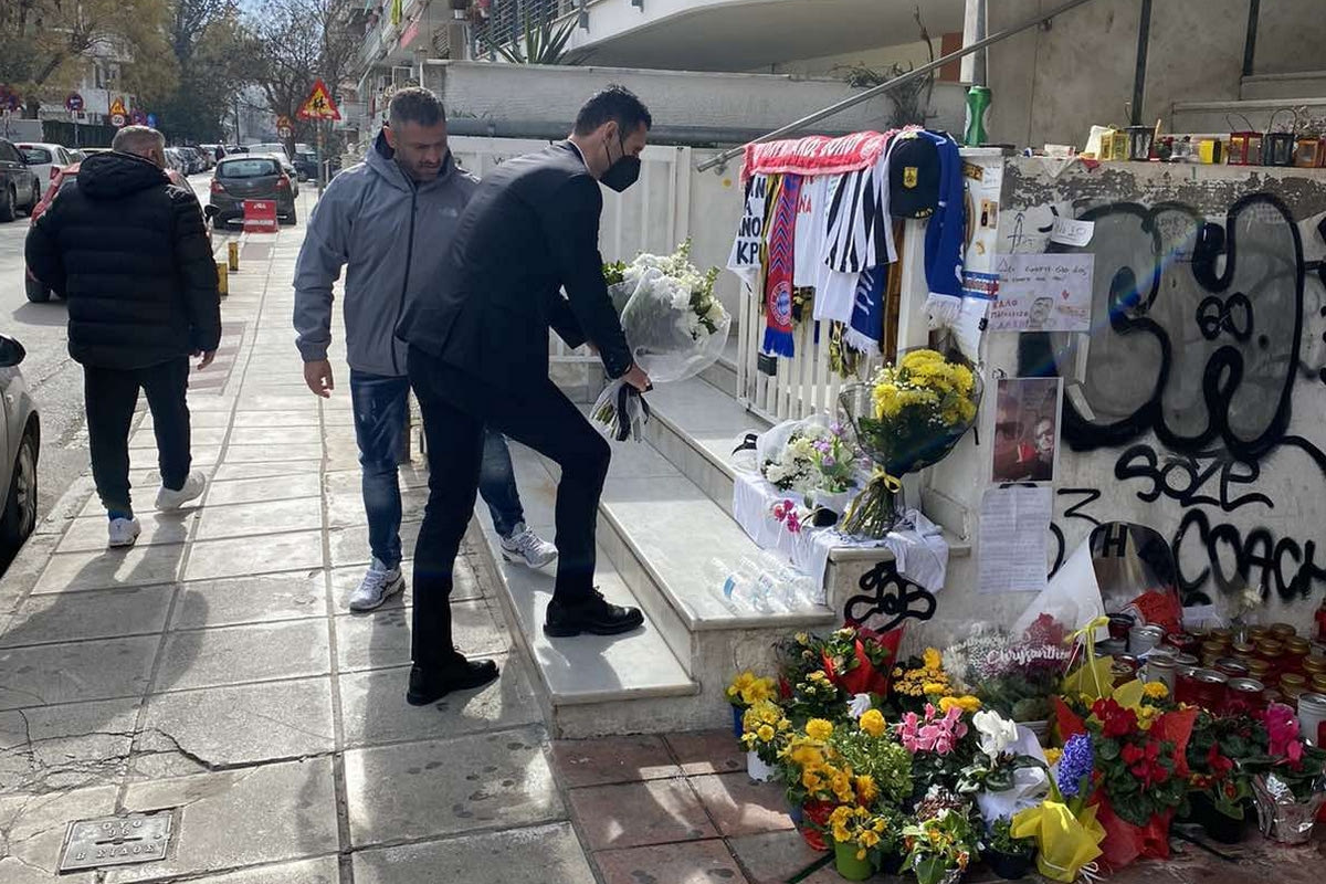Ο διευθυντής του ποδοσφαιρικού τμήματος του ΠΑΟΚ, Χρήστος Καρυπίδης, κατέθεσε λουλούδια στο σημείο της δολοφονίας του Άλκη Καμπανού.