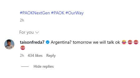 “Αrgentina? tomorrow we will talk ok”, ανέφερε συγκεκριμένα ο Τάισον, αφήνοντας να εννοηθεί ότι έρχεται μάθημα στην αυριανή προπόνηση.
