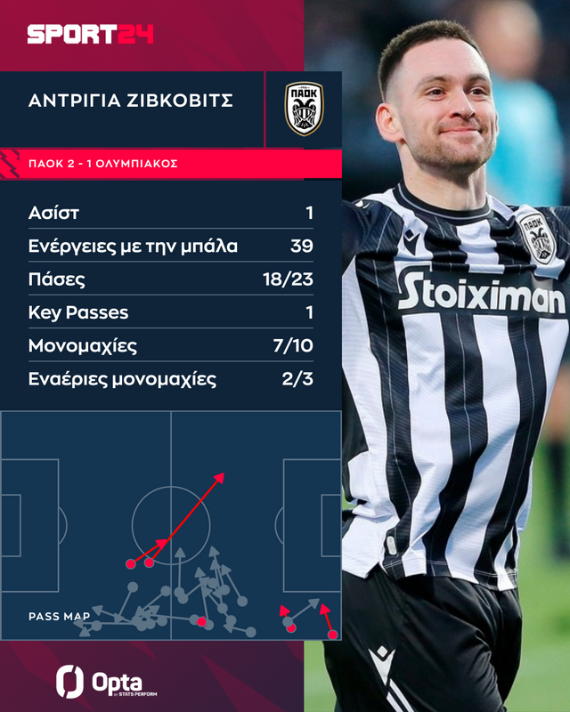 Ο Αντρίγια Ζίβκοβιτς ηγήθηκε για τον ΠΑΟΚ στη νίκη επί του Ολυμπιακού, με τον αρχηγό του Δικεφάλου να αποτελεί την πιο αξιόπιστη πηγή δημιουργίας για τους Θεσσαλονικείς στη φετινή Stoiximan Super League.