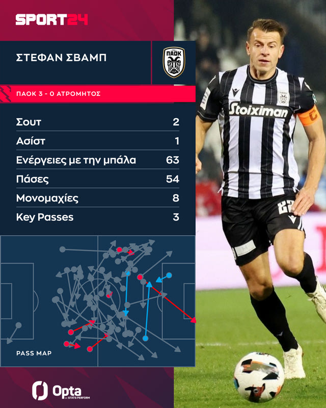 Στο γράφημα της Opta/Stats Perform, το οποίο απεικονίζει τις μεταβιβάσεις του και τις κορυφαίες επιδόσεις του στην αναμέτρηση παρουσιάζεται όλη η δουλειά που έκανε ο Σβαμπ στο παιχνίδι απέναντι στους Περιστεριώτες.