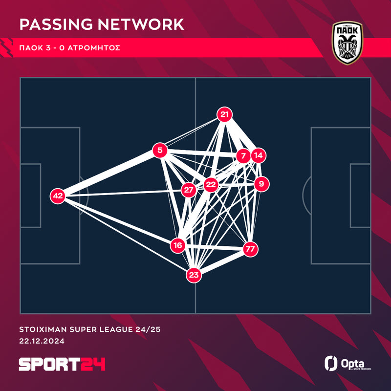 Ο Αυστριακός αποτέλεσε τον ακρογωνιαίο λίθο στην ανάπτυξη του ΠΑΟΚ, παίζοντας ακριβώς στο κέντρο της ομάδας του Ραζβάν Λουτσέσκου και λειτουργώντας ως συνδετικός κρίκος ανάμεσα στην άμυνα και την επίθεση, όπως διαφαίνεται στο γράφημα της Opta/Stats Perform (ο Σβαμπ με το νούμερο 27).