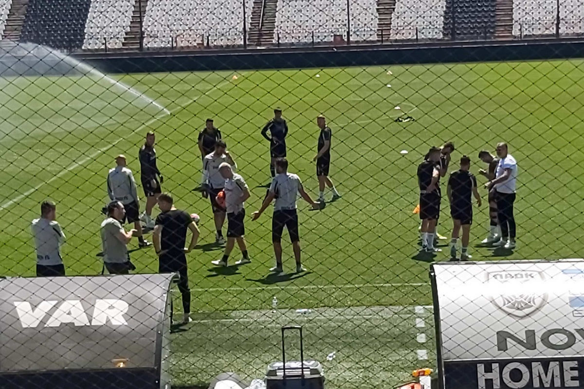 Ο ΠΑΟΚ πραγματοποίησε την τελευταία του προπόνηση στο γήπεδο της Τούμπας πριν τον τελικό Κυπέλλου με τον Παναθηναϊκό, ενώ φίλοι της ομάδας ήταν απέξω και φώναζαν συνθήματα για την κατάκτηση του τροπαίου.