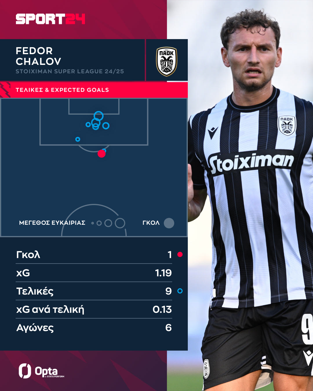 Ο Ρώσος κεντρικός επιθετικός έχει πετύχει ένα γκολ, αυτό με τον Βόλο για το 4-1 του Δικεφάλου. Συνολικά έχει εννέα τελικές, οι περισσότερες μέσα από την περιοχή με συνολική “αξία” 1.19xG, ενώ έχει και 0.13xG ανά τελική.