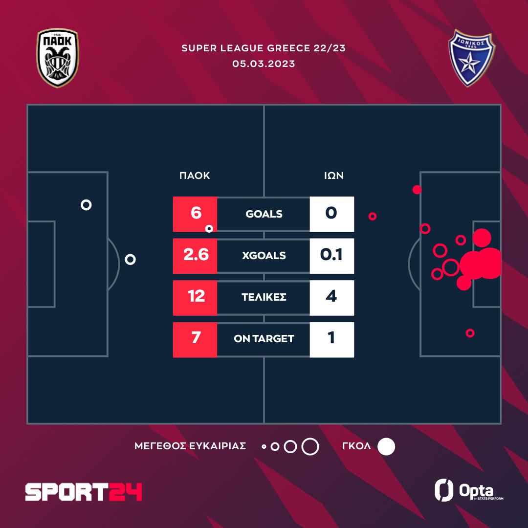 Ο Ιωνικός προσπάθησε από την πλευρά του να απειλήσει και τα κατάφερε στο 13′ με το σουτ του Σεμπά που έφυγε λίγο έξω από το δεξί δοκάρι του Κοτάρσκι αλλά εν συνεχεία ήρθε ένα “καταιγιστικό” εξάλεπτο από τον ΠΑΟΚ με τρία γκολ.