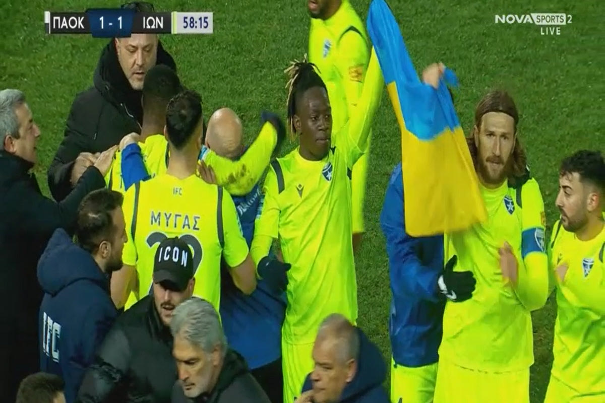 Οι παίκτες του Ιωνικού ύψωσαν τη σημαία της Ουκρανίας μετά το γκολ κόντρα στον ΠΑΟΚ NOVA