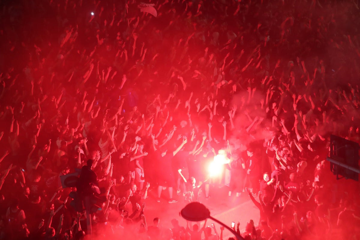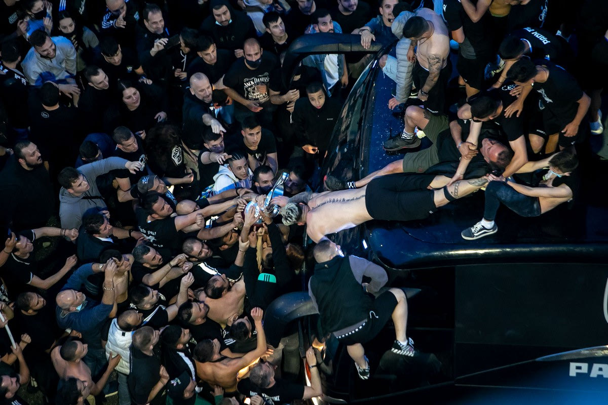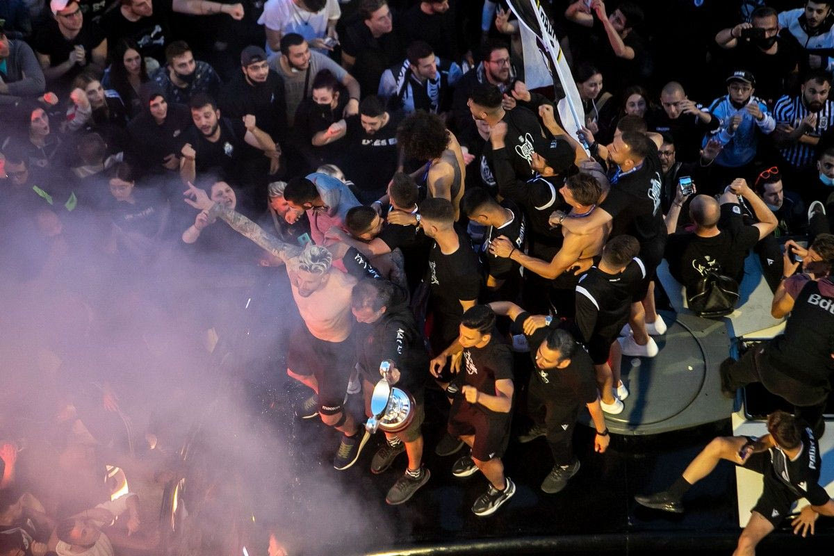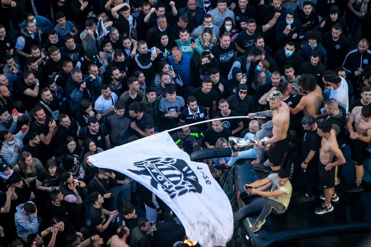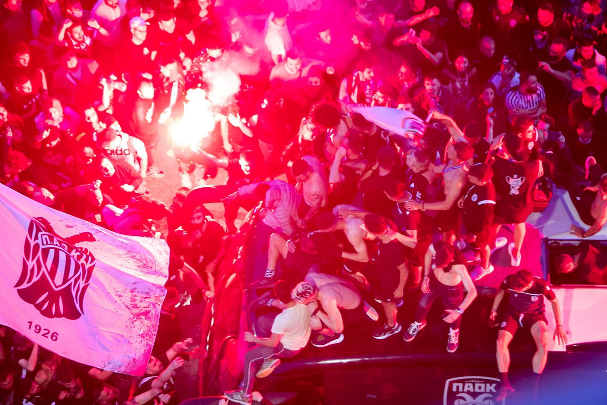 Εκεί, οι οπαδοί του Δικεφάλου συνέχιζαν το πάρτι, το οποίο πήρε “φωτιά”, όταν έφτασε και η αποστολή του ΠΑΟΚ. Παίκτες του Δικεφάλου βρίσκονταν στην οροφή του λεωφορείου κρατώντας το Κύπελλο, με τους χιλιάδες οπαδούς να τους αποθεώνουν με συνθήματα και καπνογόνα δημιουργώντας μία γιορτινή ατμόσφαιρα.