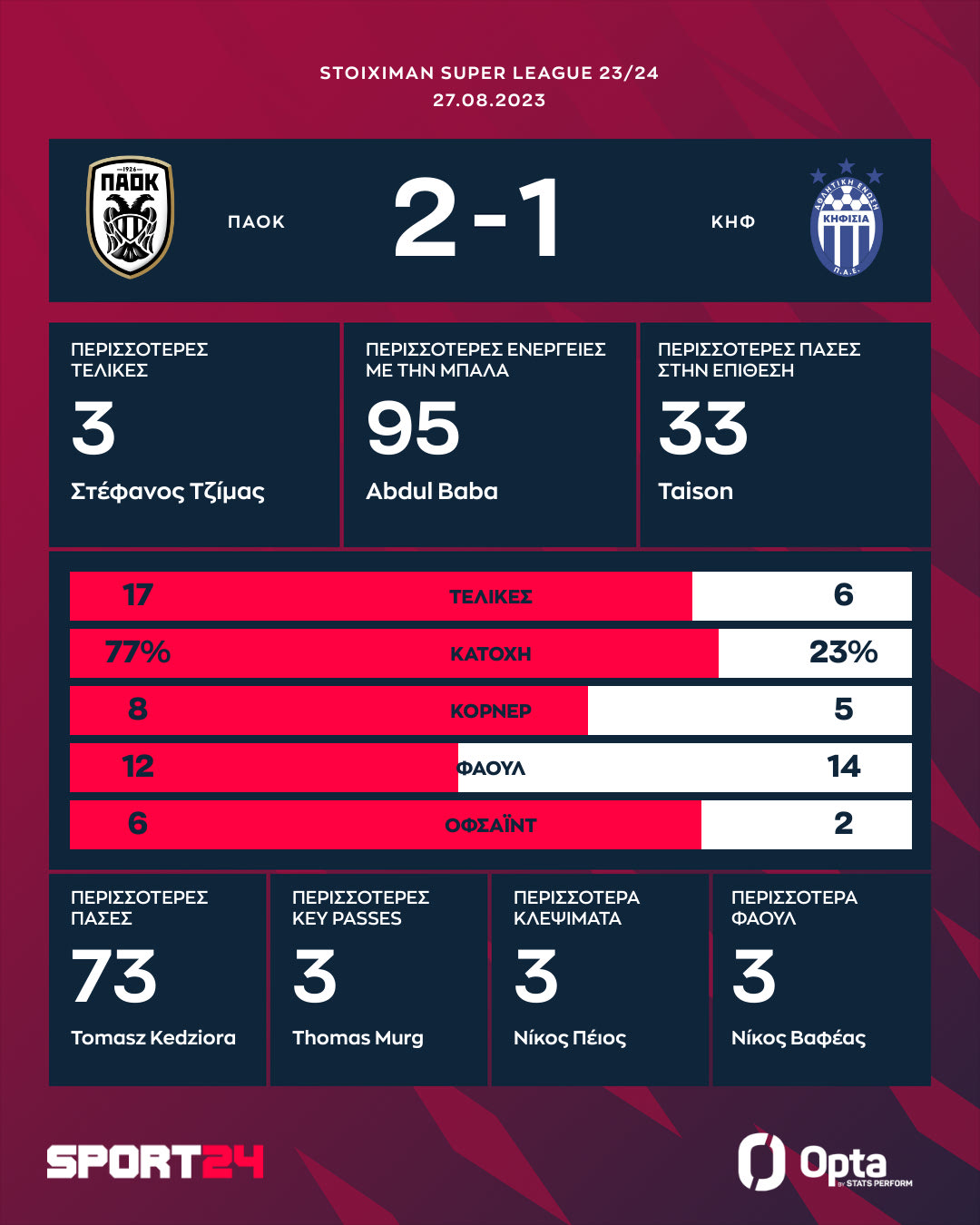 Ο ΠΑΟΚ δεν είχε εύκολη δουλειά κόντρα στην Κηφισιά, ωστόσο έκανε τη δουλειά στο τέλος, επικρατώντας 2-1 στην Τούμπα, με την οποία ντούμπλαρε τις νίκες στη Stoiximan Super League. Ταυτόχρονα πηγαίνει με καλή φορά στη ρεβάνς με τη Χαρτς για την πρόκριση στους ομίλους του Conference League.