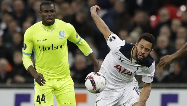 Tottenham's Mousa Dembele, second left, vies for the ball with Gent's Anderson Esiti, left, during a Europa League round of 32 second leg soccer match between Tottenham Hotspur and Gent at Wembley stadium in London Thursday, Feb. 23, 2017. (AP Photo/Matt Dunham)