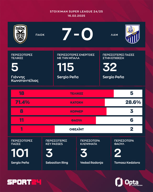 Με απόλυτο πρωταγωνιστή τον Γιάννη Κωνσταντέλια που σημείωσε χατ-τρικ, ο ΠΑΟΚ κατατρόπωσε με 7-0 τη Λαμία στην Τούμπα για την 23η "στροφή" Stoiximan Super League πετυχαίνοντας τουλάχιστον πέντε γκολ για δεύτερη συνεχόμενη αγωνιστική.