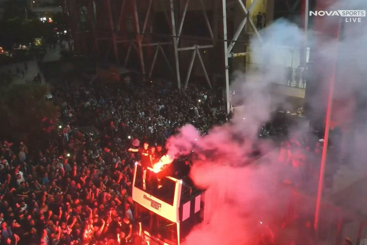 Οι παίκτες του ΠΑΟΚ και το τεχνικό επιτελείο μπήκαν σε ανοιχτό λεωφορείο για να πάνε στον Λευκό Πύργο και τους δρόμους της Θεσσαλονίκης και να αποθεωθούν από τον κόσμο τους.