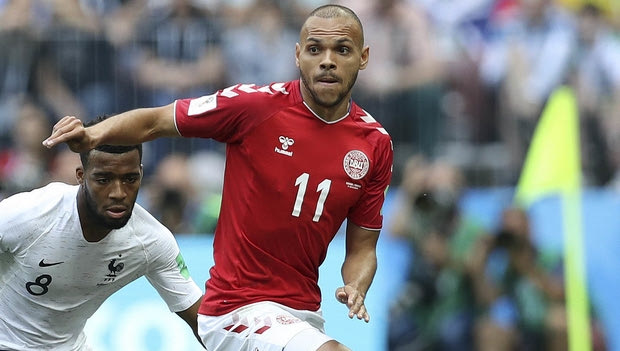 France's Thomas Lemar, left, and Denmark's Martin Braithwaite challenge for the ball during the group C match between Denmark and France at the 2018 soccer World Cup at the Luzhniki Stadium in Moscow, Russia, Tuesday, June 26, 2018. (AP Photo/David Vincent)