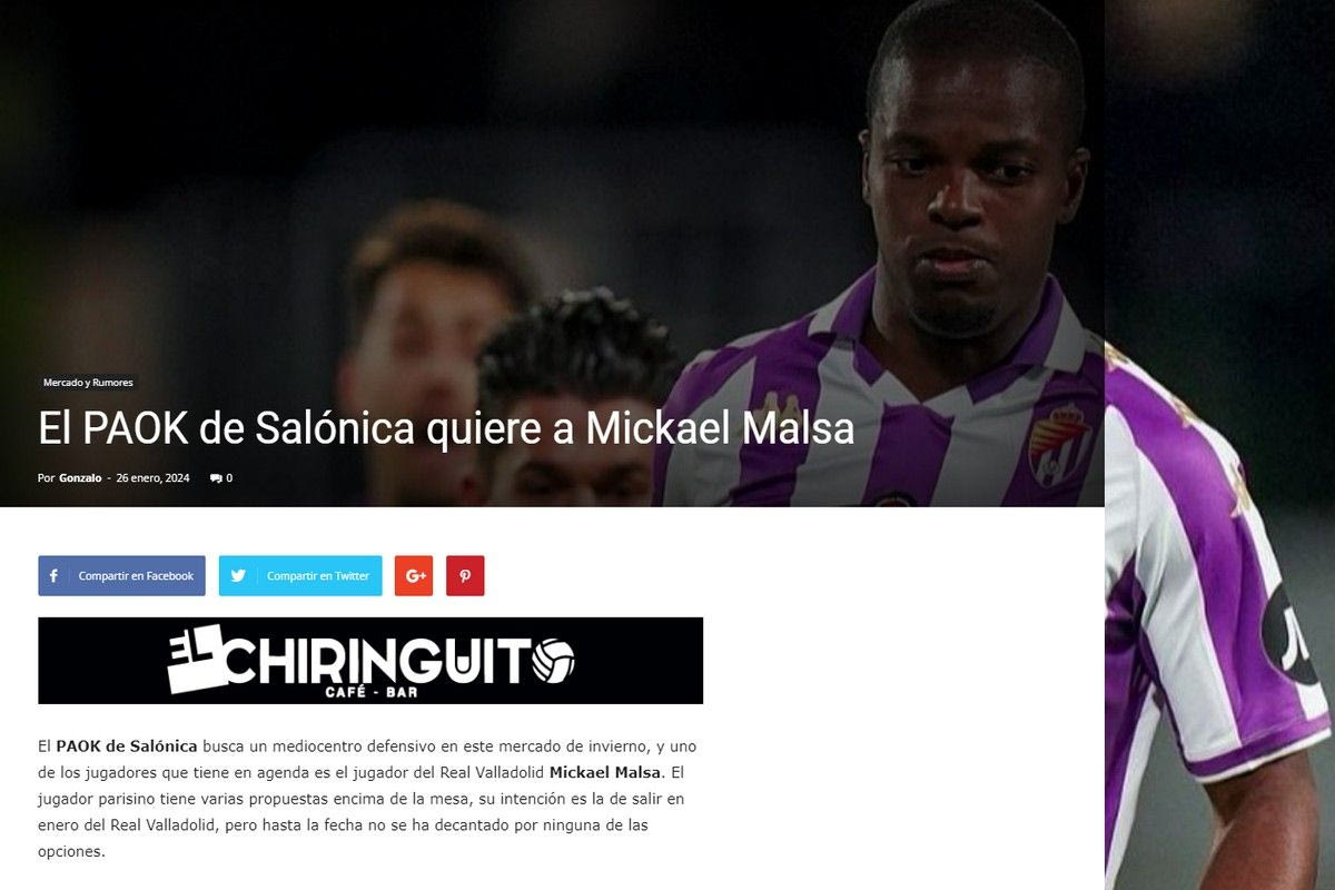 “Ο ΠΑΟΚ αναζητά αμυντικό χαφ στη φετινή χειμερινή αγορά και ένας από τους παίκτες της ατζέντας του είναι ο παίκτης της Ρεάλ Βαγιαδολίδ, Μίκαελ Μάλσα. Ο Παριζιάνος έχει αρκετές προτάσεις στο τραπέζι, πρόθεσή του είναι να φύγει από τη Ρεάλ Βαγιαδολίδ τον Ιανουάριο, αλλά μέχρι σήμερα δεν έχει επιλέξει καμία από τις διαθέσιμες ομάδες.