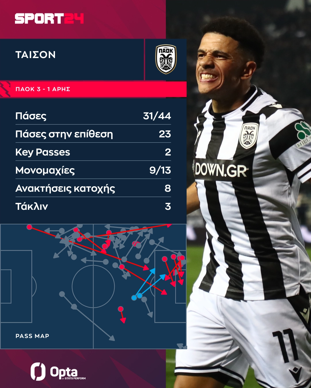 Κανείς παίκτης του ΠΑΟΚ δεν είχε περισσότερες πάσες στο αντίπαλο μισό από τον Τάισον, που είχε 34, ενώ ο 37χρονος ήταν πρώτος και σε πάσες στο τελευταίο τρίτο του γηπέδου με 8.