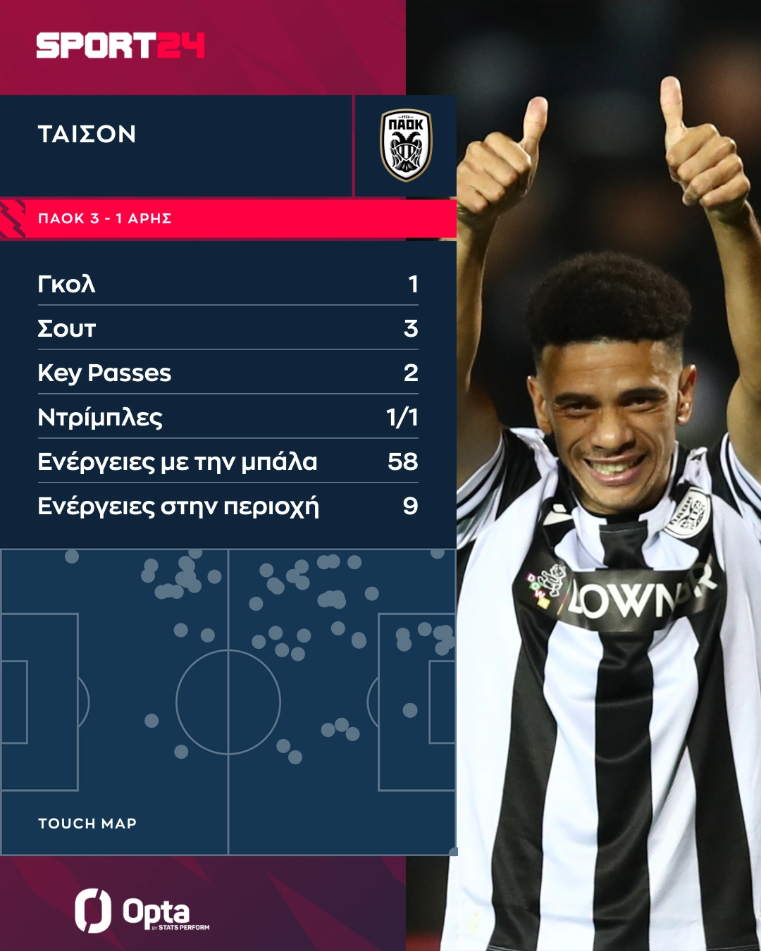 Το touch map και οι κορυφαίες επιδόσεις του Τάισον στο ΠΑΟΚ – ΆρηςΌμως το παραπάνω είναι απλώς η κορυφή του παγόβουνου για τον Τάισον. Ο γεννημένος στην Πελότας μεσοεπιθετικός είχε 9 ενέργειες στη μεγάλη περιοχή του Άρη, είχε 2 key passes, φέρνοντας τους συμπαίκτες του σε θέση βολής, ενώ είχε και 1 επιτυχημένη ντρίμπλα.
