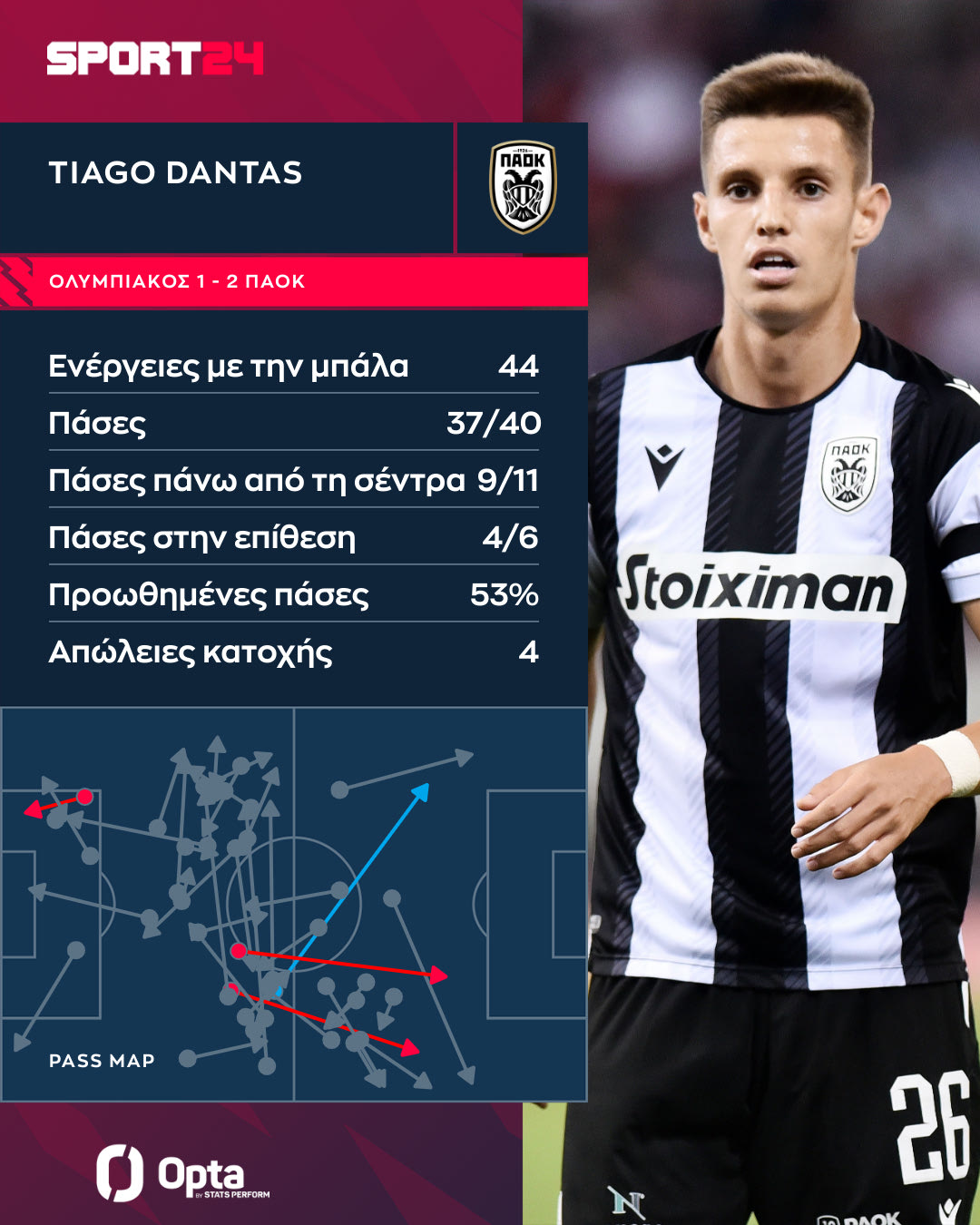 Ο Ντάντας είχε 44 ενέργειες με την μπάλα και 37/40 μεταβιβάσεις, με το 53% να είναι προωθημένες, προς τα μπροστά.