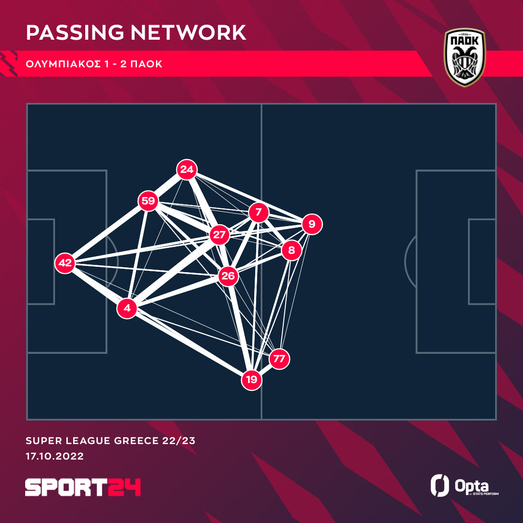 Δείτε στο γράφημα της Opta τον χώρο δράσης και τις μεταβιβάσεις των παικτών του ΠΑΟΚ στο “Καραϊσκάκης”.