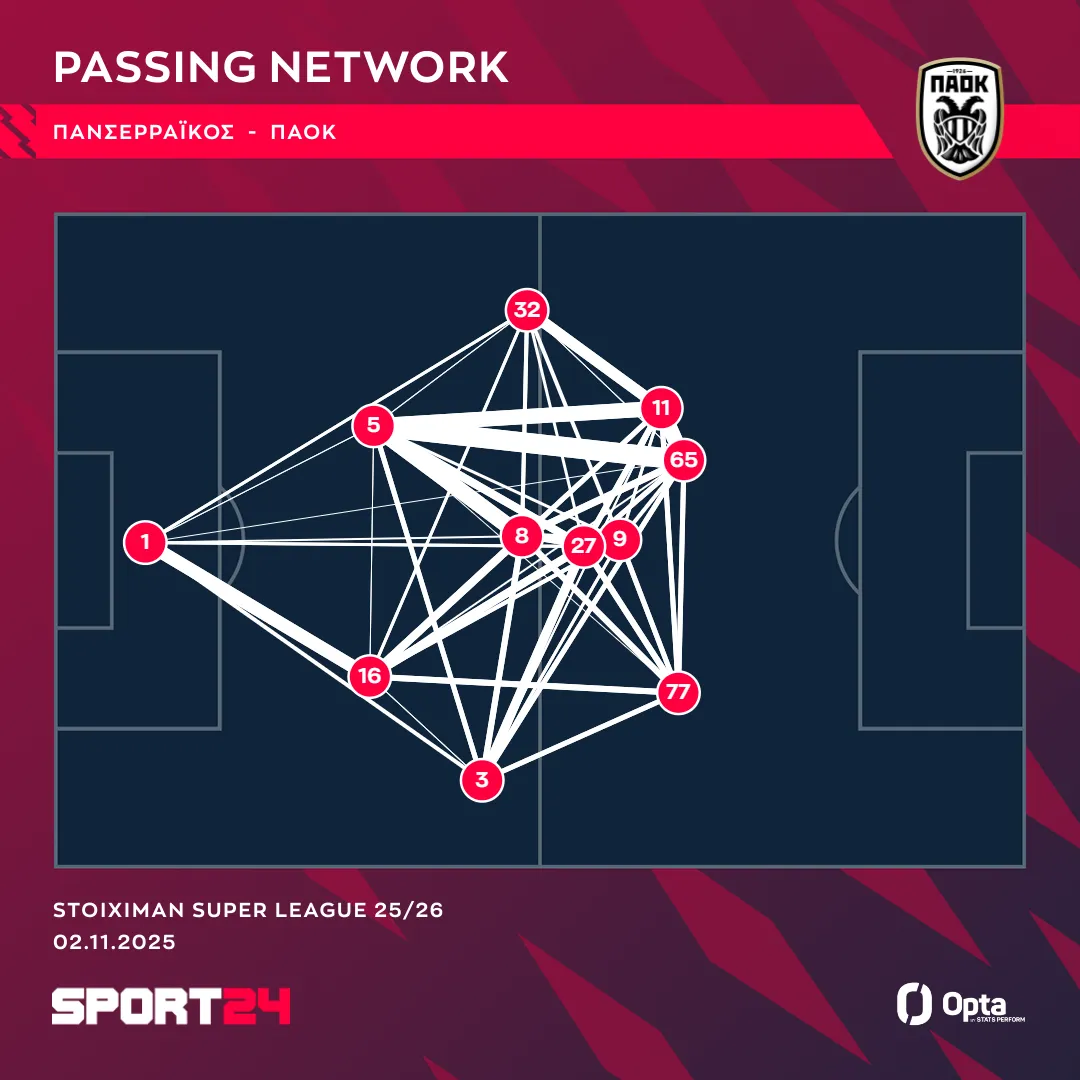 Ο Τσάλοφ (9) βέβαια κινήθηκε κυρίως μακριά από την περιοχή και είχαν παρόμοιο χώρο δράσης με τον Οζντόεφ (27). Ο Ρώσος χαφ ερχόταν αρκετές φορές από τα μετόπισθεν, φορτώνοντας την περιοχή του Πανσερραϊκού, εκεί που ήδη έκαναν τα δικά τους οι Κωνσταντέλιας (65), Τάισον (11) και Ντεσπόντοβ (77).