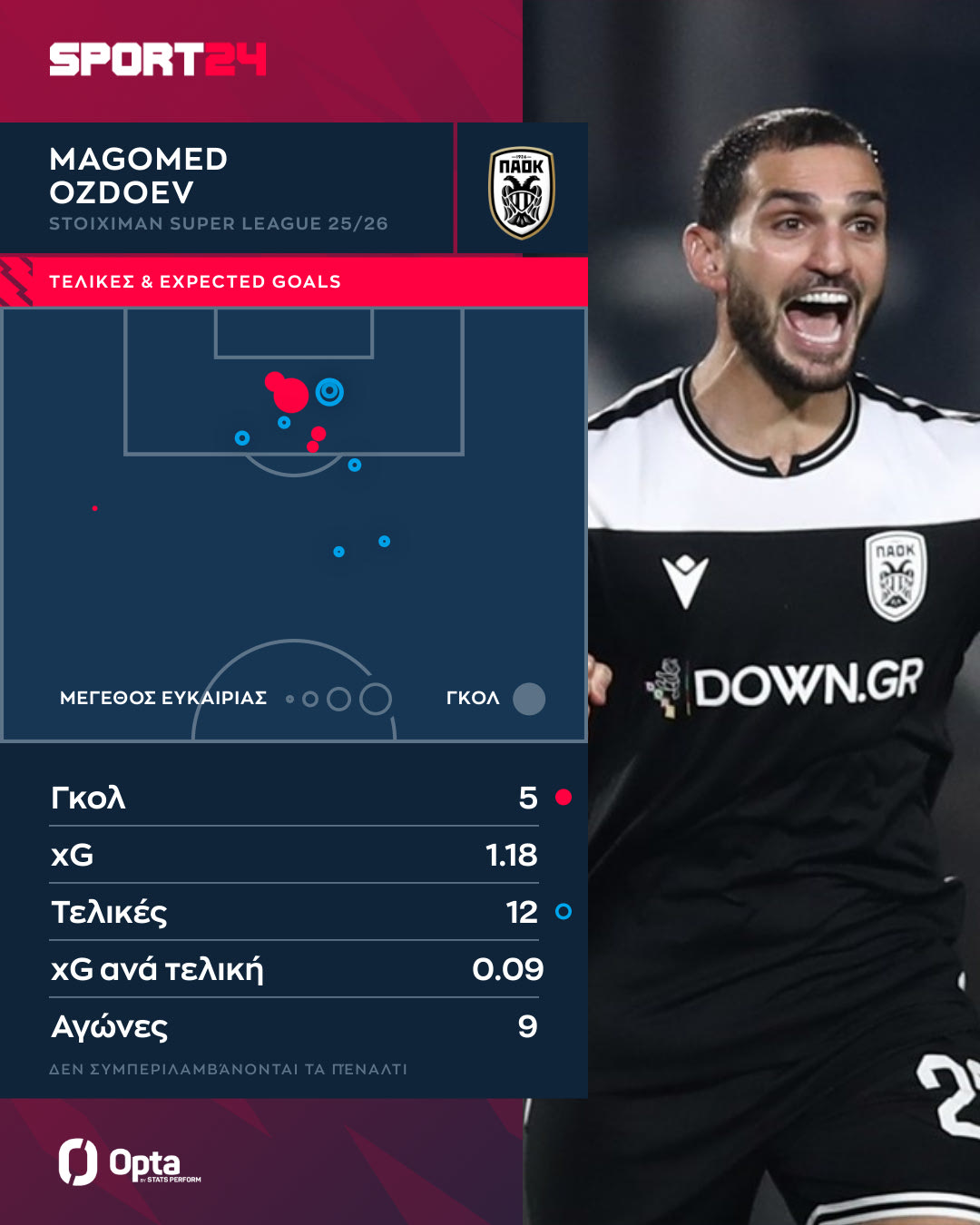 Ο Οζντόεφ έχει συνολικά 12 τελικές φέτος και μάλιστα οι περισσότερες εξ αυτών, οι εννέα συγκεκριμένα, είναι μέσα από την αντίπαλη περιοχή. Όλα του γκολ είναι μέσα από το “κουτί”, ενώ συνολικά οι τελικές του αξίζουν 1.18xG.
