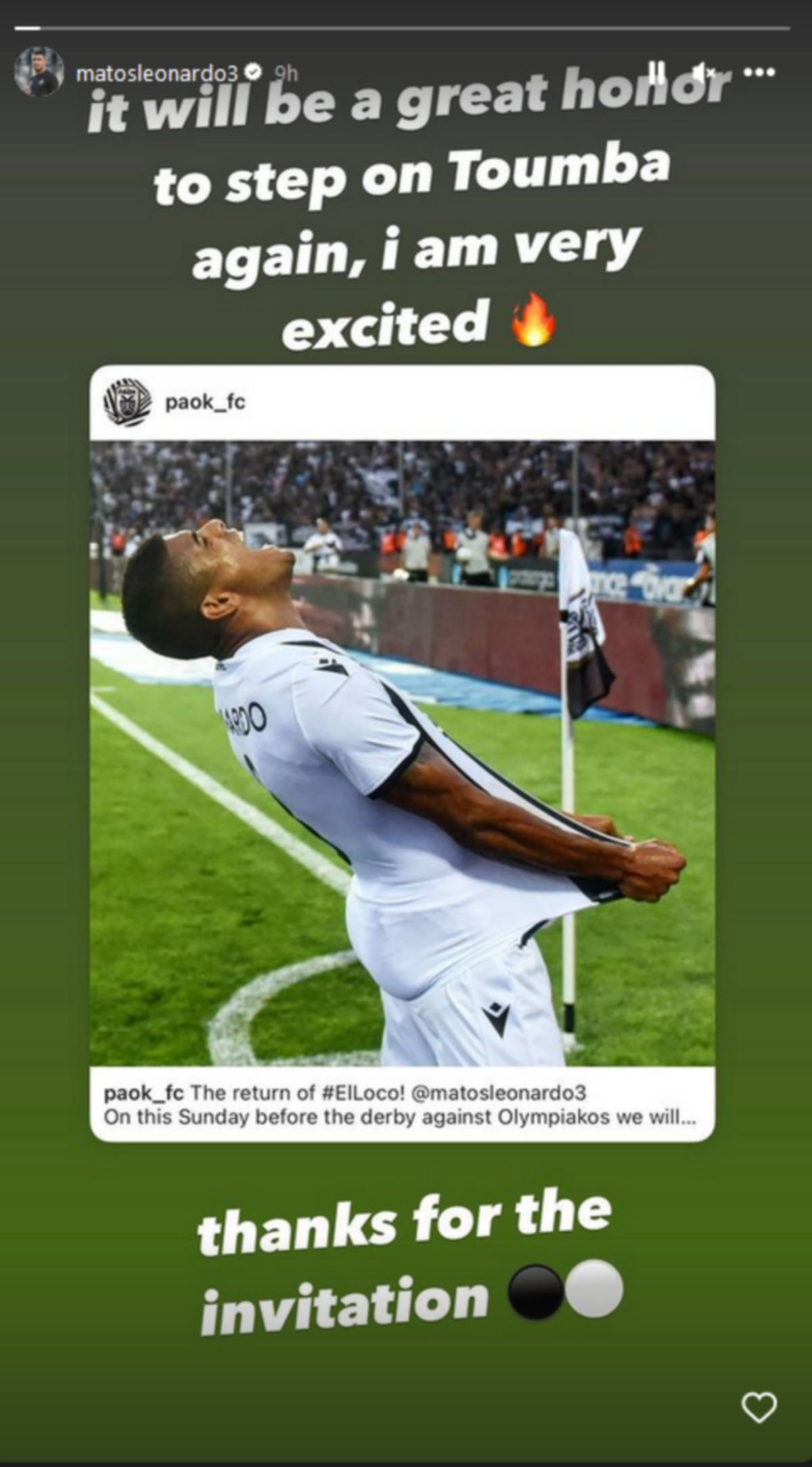 Ο Λέο Μάτος θα βρεθεί στην Τούμπα στο ντέρμπι με τον Ολυμπιακό και θα τιμηθεί από τον ΠΑΟΚ για την προσφορά του στην ομάδα, με τον Βραζιλιάνο να μην κρύβει την ανυπομονησία του για αυτό το γεγονός.