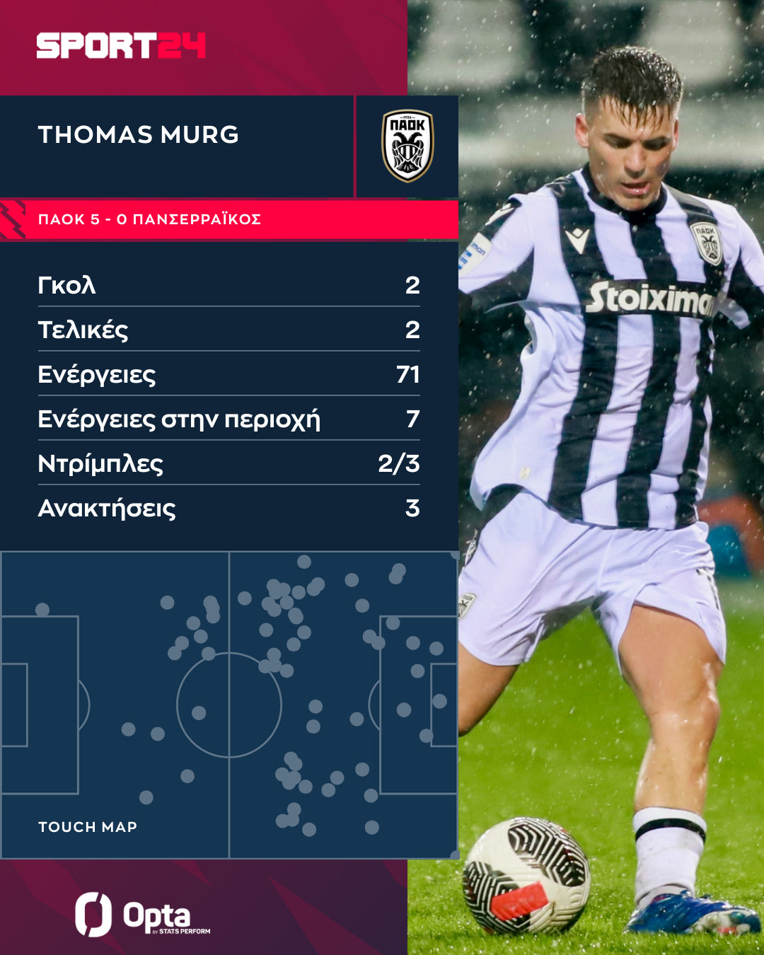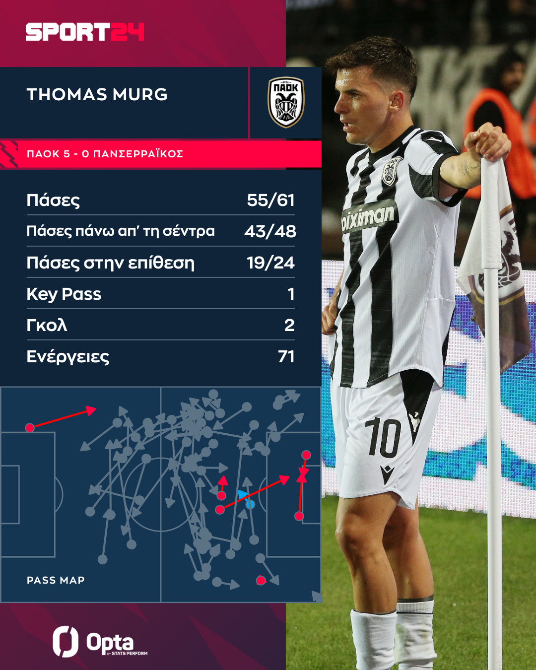 Ο Μουργκ ήταν ο πρωταγωνιστής σε αυτό το τρίποντο του Δικεφάλου. Ήταν εκείνος που διπλασίασε τα τέρματα του Δικεφάλου στο 28ο λεπτό μετά την ασίστ του Τάισον, ενώ στο 71ο λεπτό απλοποίησε ακόμη περισσότερο τα πράγματα για τον ΠΑΟΚ όταν έκανε το 3-0 με σουτ από κοντά.