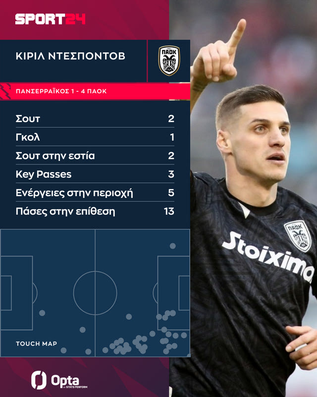Είναι δε χαρακτηριστικό πως πριν από τα τρία γκολ του στα τελευταία τρία παιχνίδια του ΠΑΟΚ, ο Ντεσπόντοβ είχε καταφέρει να πετύχει μόλις δύο γκολ στα προηγούμενα 22 ματς τη φετινή σεζόν.