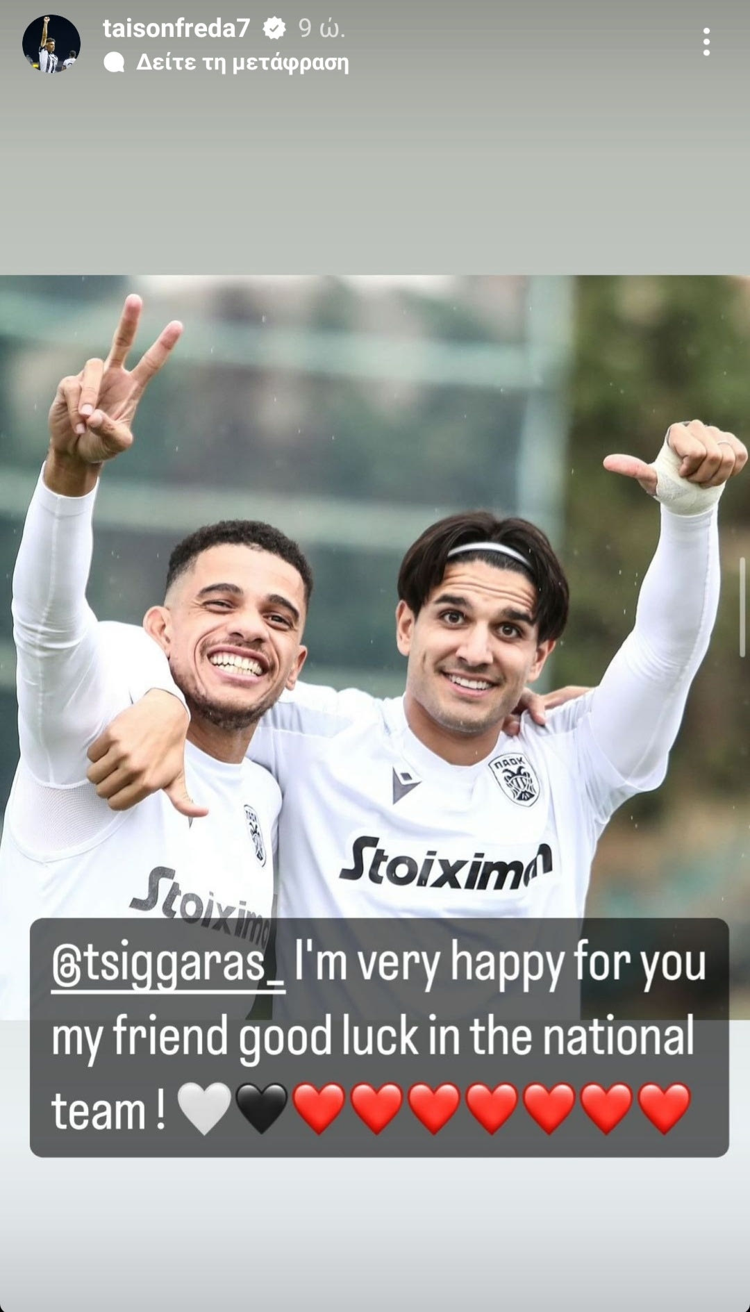 Ο Βραζιλιάνος δεν έκρυψε την χαρά του και για τον Χάρη Τσιγγάρα που κλήθηκε την Κυριακή (19/11) εσπευσμένα από τον Γκουστάβο Πογέτ στο αντιπροσωπευτικό μας συγκρότημα. “Είμαι πολύ χαρούμενος για σένα φίλε μου. Καλή επιτυχία στην Εθνική ομάδα” έγραψε ο Τάισον στην ανάρτησή του στο Instagram μόλις έγινε γνωστή η κλήση του Τσιγγάρα.
