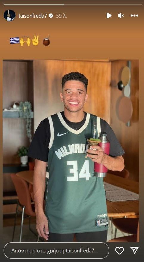 Ο Βραζιλιάνος μεσοεπιθετικός του ΠΑΟΚ ανέβασε ένα story στο οποίο φορά φανέλα του Γιάννη Αντετοκούνμπο (το φανερώνει ο αριθμός “34” που φοράει ο Greek Freak), αλλά και ένα emoji με τη σημαία της χώρας μας.