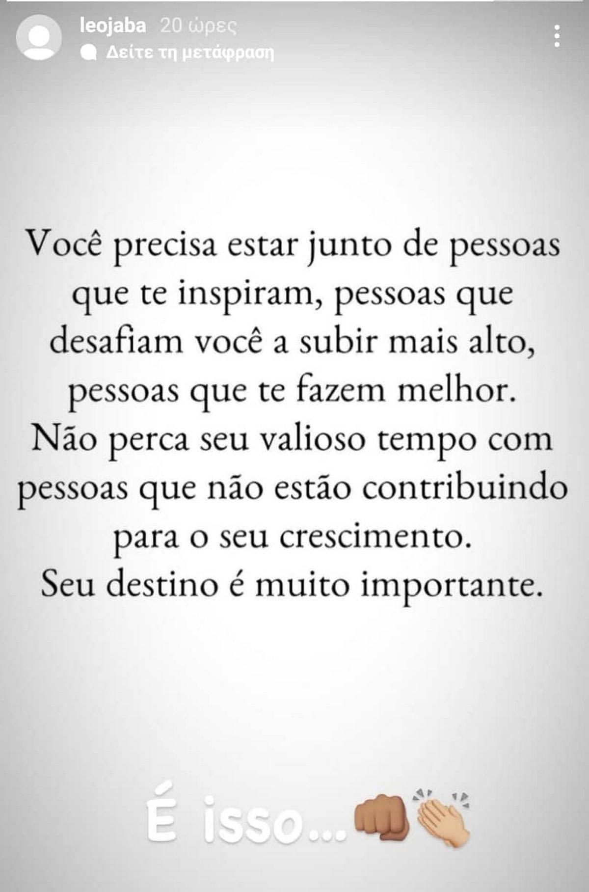 “Πρέπει να βρίσκεσαι κοντά σε ανθρώπους που σε εμπνέουν, ανθρώπους που σε προκαλούν να ανέβεις ψηλότερα, ανθρώπους που σε κάνουν καλύτερο. Μην σπαταλάτε τον πολύτιμο χρόνο σας με άτομα που δεν συμβάλουν στην ανάπτυξη σας. Ο προορισμός σας είναι πολύ σημαντικός” έγραφε η ανάρτηση τον Ζαμπά να επικροτεί.