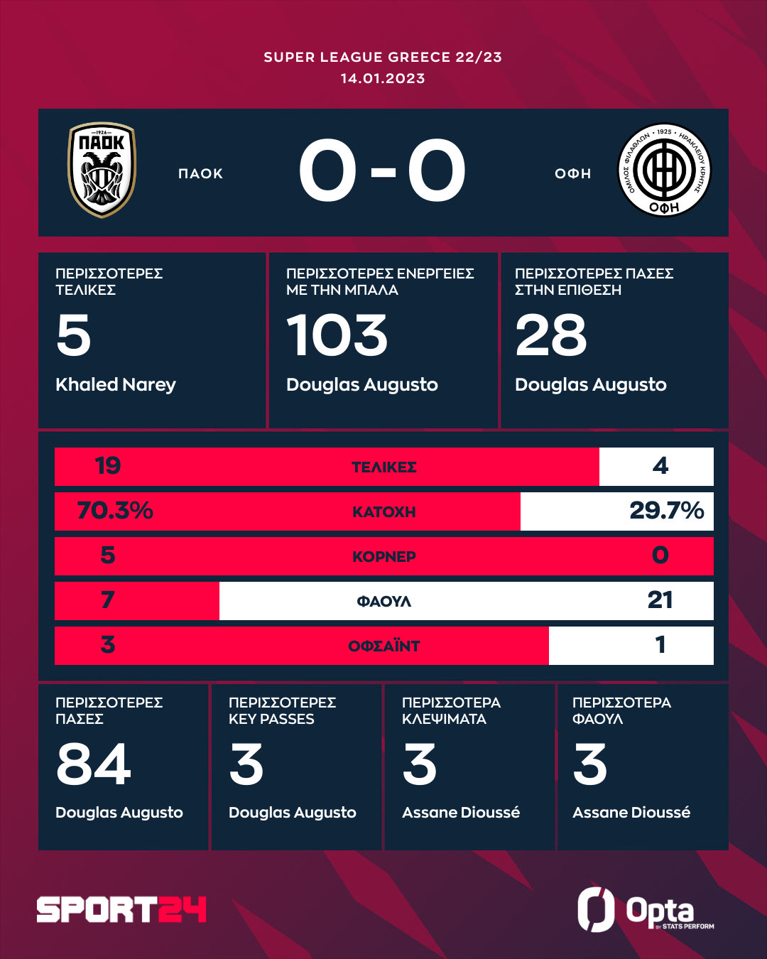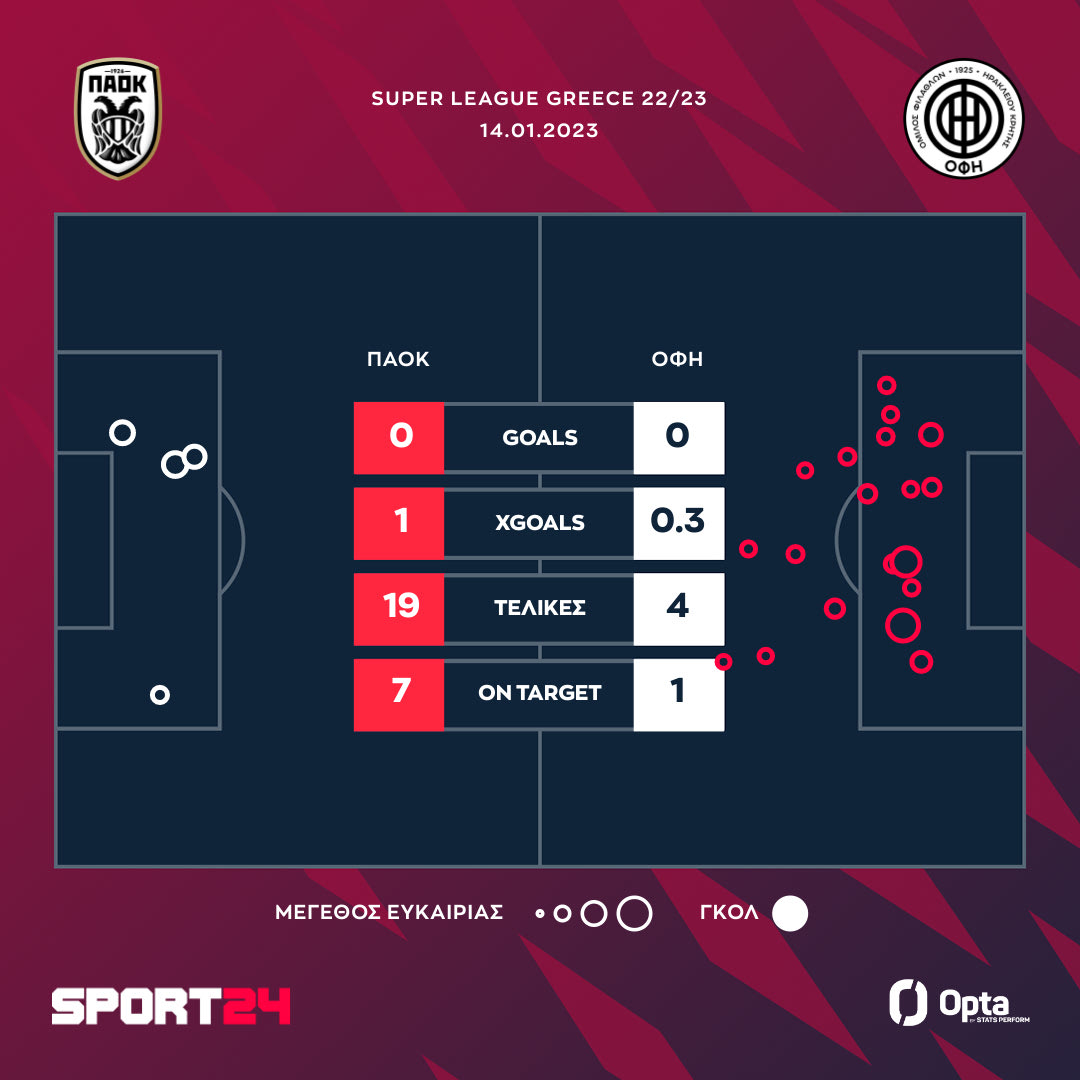 Στο 90+2′ ο ΟΦΗ είχε την ευκαιρία να κλέψει το παιχνίδι. Οι Κρητικοί έφυγαν στην κόντρα, με τον Ντίκο να γυρίζει την μπάλα στον Περέα, το σουτ το οποίου σταμάτησε στο δοκάρι του Κοτάρσκι. Κάπως έτσι, το 0-0 παρέμεινε έως το φινάλε, με τον ΠΑΟΚ να στραβοπατά και τους φιλοξενουμένους να φεύγουν με θετικό αποτέλεσμα.