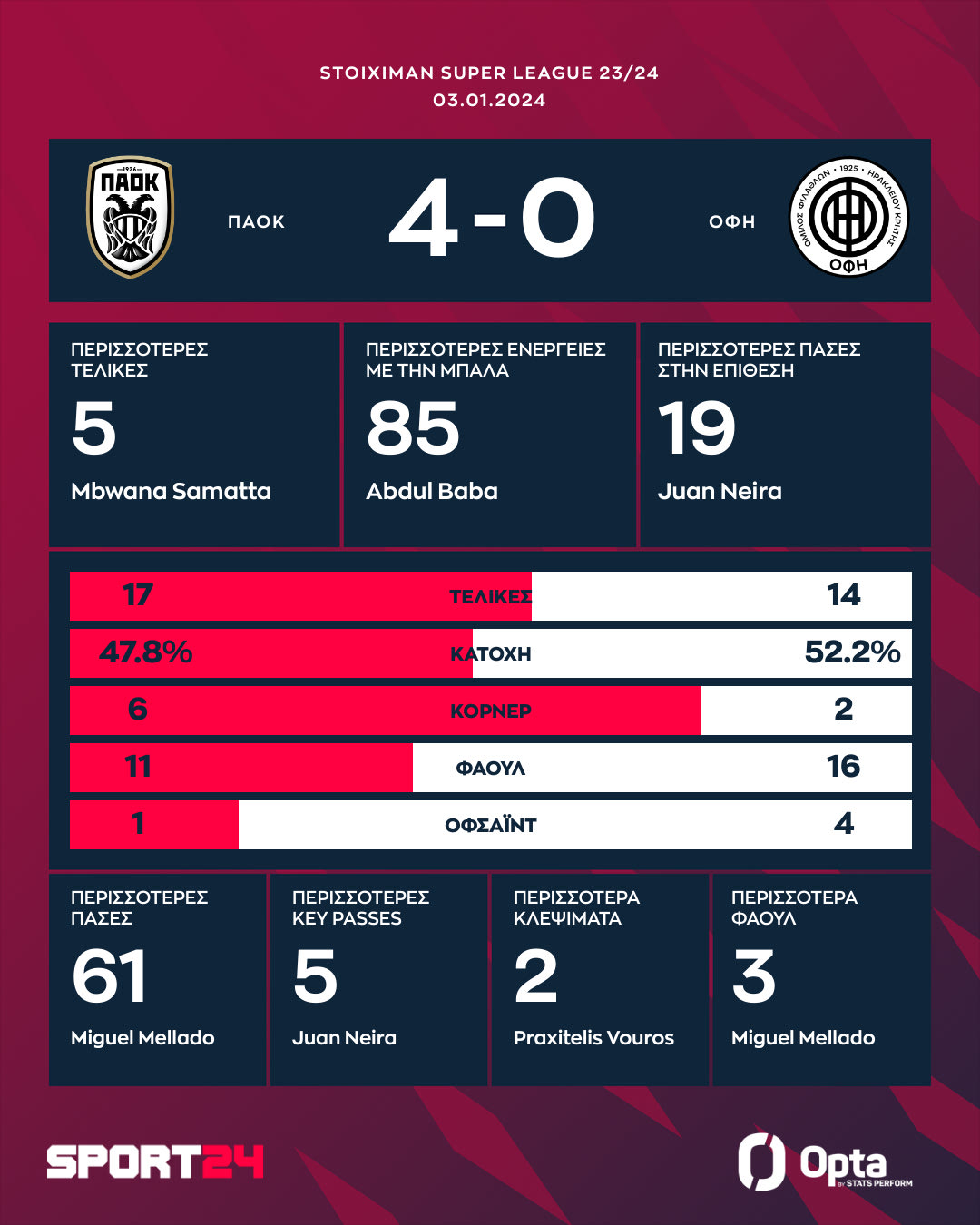 Σούπερ ξεκίνησε ο ΠΑΟΚ το 2024, επικρατώντας 4-0 του ΟΦΗ στην Τούμπα για την 20η αγωνιστική της Stoiximan Super League έχοντας τέσσερις διαφορετικούς σκόρερ (39' Ντεσπόντοβ, 31' Μπάμπα, 89' Αντόνιο, 90+3' Τόμας) και δύο ασίστ Ντεσπόντοβ.