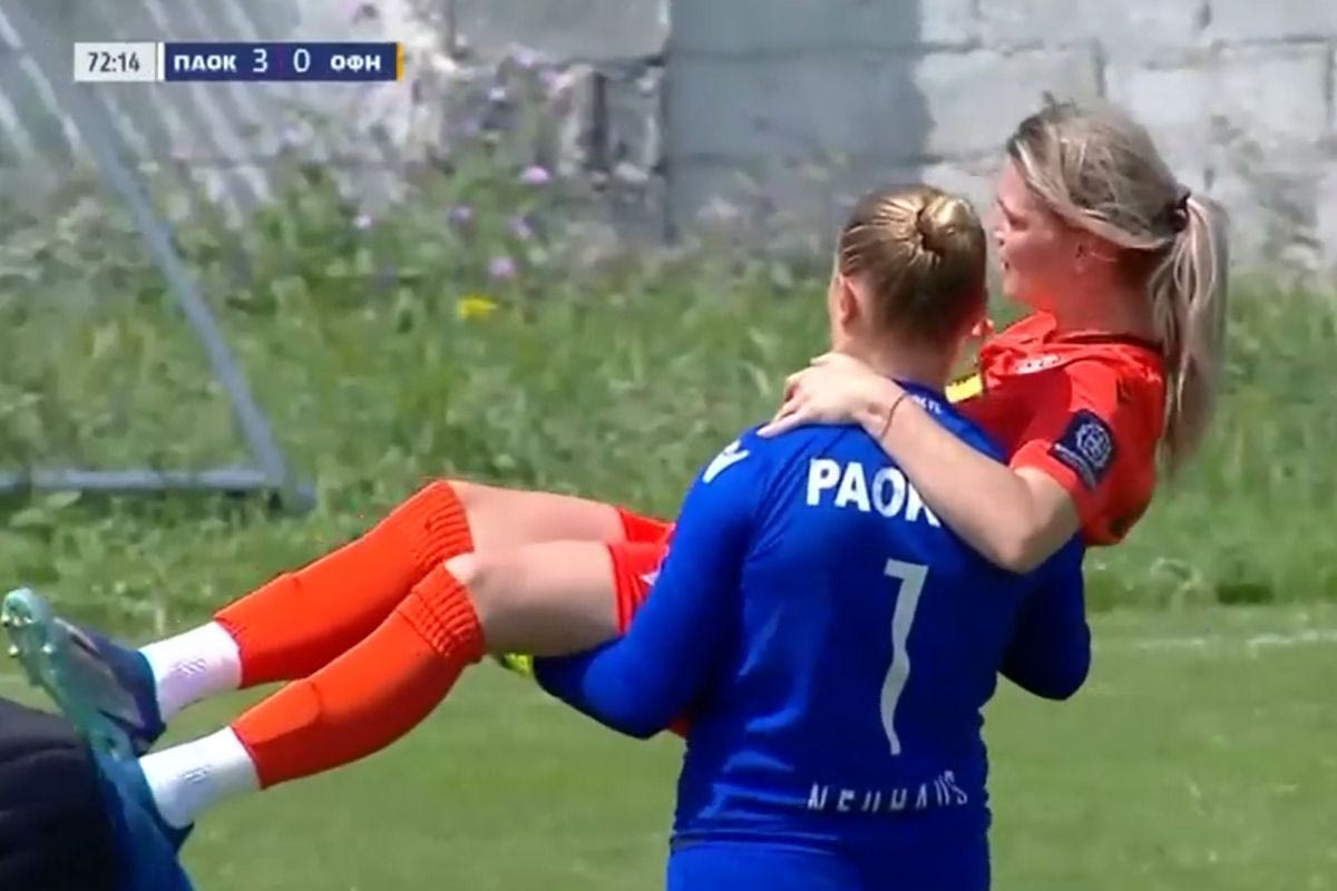 Η Νικόλ Ριμπάνσκα του ΟΦΗ αποχώρησε απαρηγόρητη από τον αγωνιστικό χώρο, με την τερματοφύλακα του ΠΑΟΚ, Νόιχαους, να την παίρνει στα χέρια της για να την βγάλει έξω.