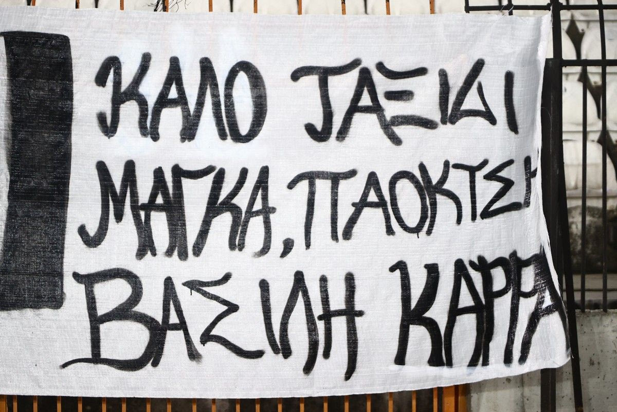 Το πανό έγραφε: “ΠΑΟΚ, ουίσκι και του Καρρά οι δίσκοι… Καλό ταξίδι, μάγκα, παοκτσή, Βασίλη Καρρά”.