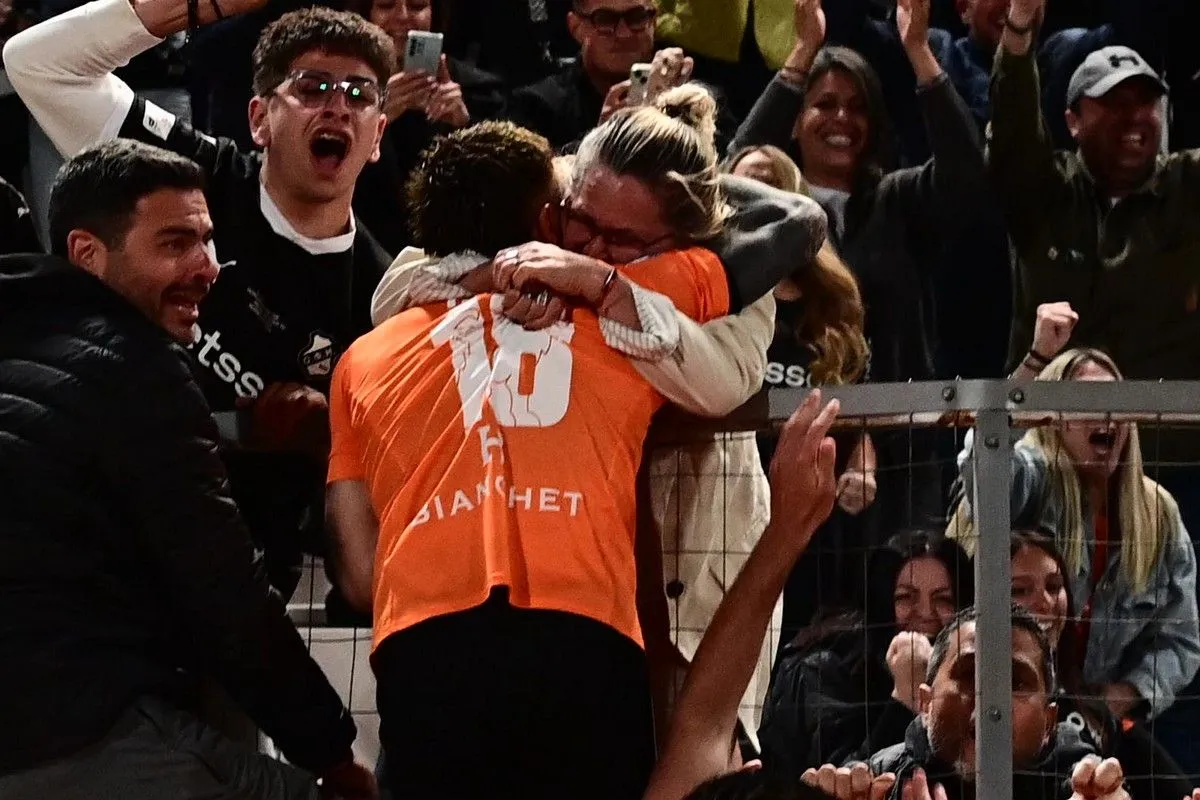 Ανέβηκε στα κάγκελα της εξέδρας και “πνίγηκε” στην αγκαλιά της δακρυσμένης μητέρας του, η οποία επίσης σκαρφάλωσε στα κάγκελα για να αγκαλιάσει τον γιο της, που έβαλε μπροστά στο σκορ τον ΟΦΗ απέναντι στον ΠΑΟΚ, στο 50ο λεπτό.