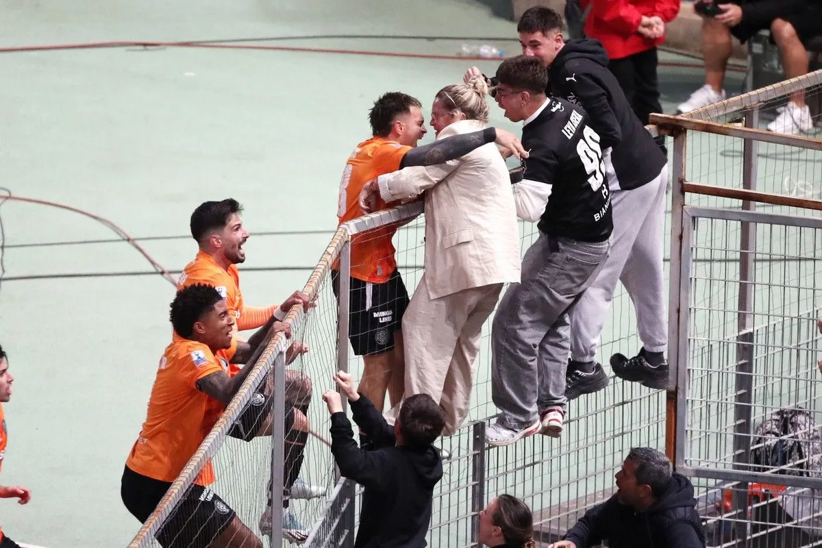Ο Νους με εκπληκτικό τρόπο έκανε το 2-1 για τον ΟΦΗ και αμέσως μετά πανηγύρισε έξαλλα μέσα στην αγκαλιά της δακρυσμένης μητέρας του, σκαρφαλώνοντας στα κάγκελα της εξέδρας.