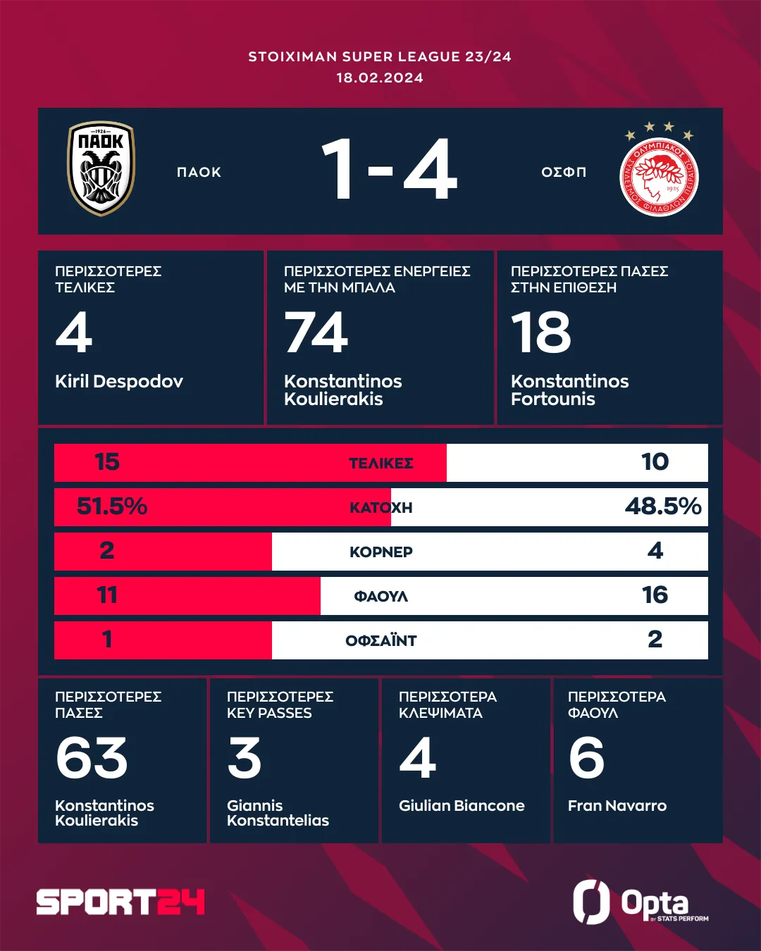 Πρωταγωνιστής για τους Πειραιώτες ήταν ο Ποντένσε, ο οποίος είχε γκολ και ασίστ. Ο Ναβάρο άνοιξε το σκορ στο 29′, με τον Ντεσπόντοφ να φέρνει στα ίσα το παιχνίδι στο 39ο λεπτό. Ο Πορτογάλος εξτρέμ με απίθανο γκολ έβαλε ξανά τους ερυθρόλευκους σε θέση οδηγού στο 54′.